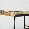 Metal legs, table top in stone material, glass top.
