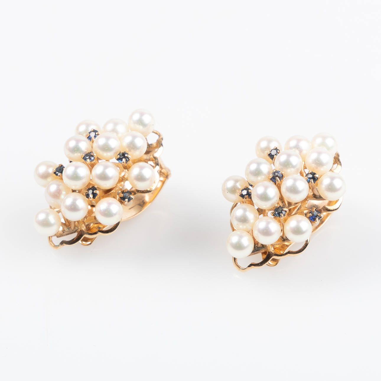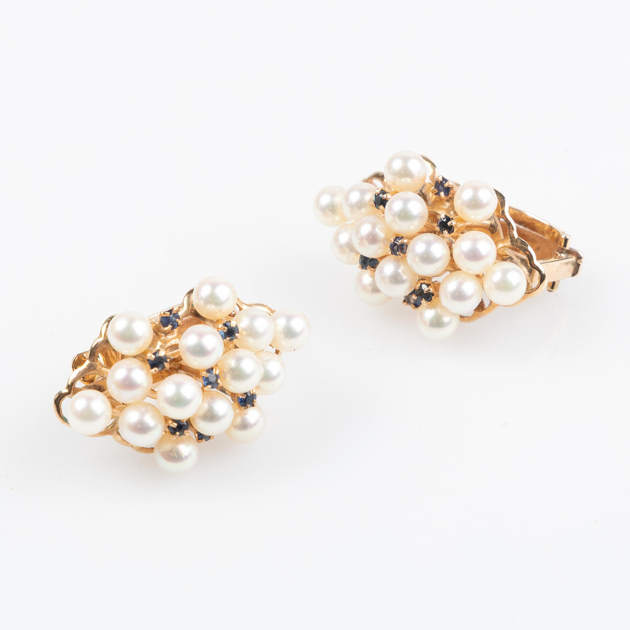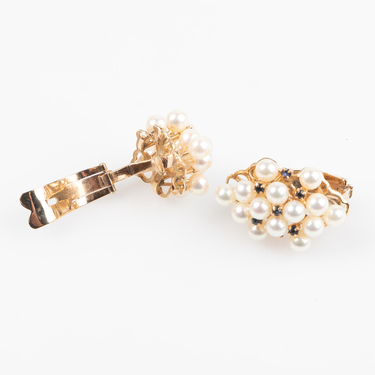 Framed with cultured pearls and small sapphires. H about 25 mm. Box included.