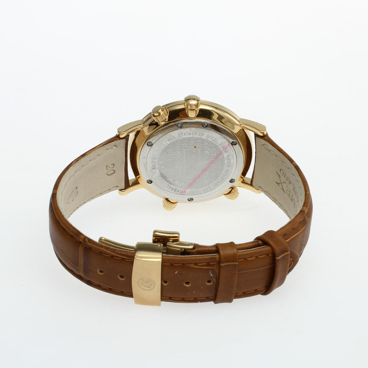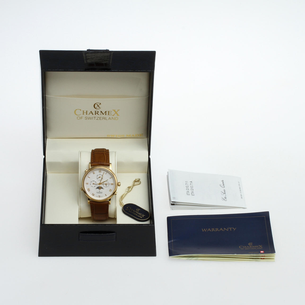 Gilded estate. White dial with hands for day, month and date as well as moon phase. Original box included.