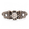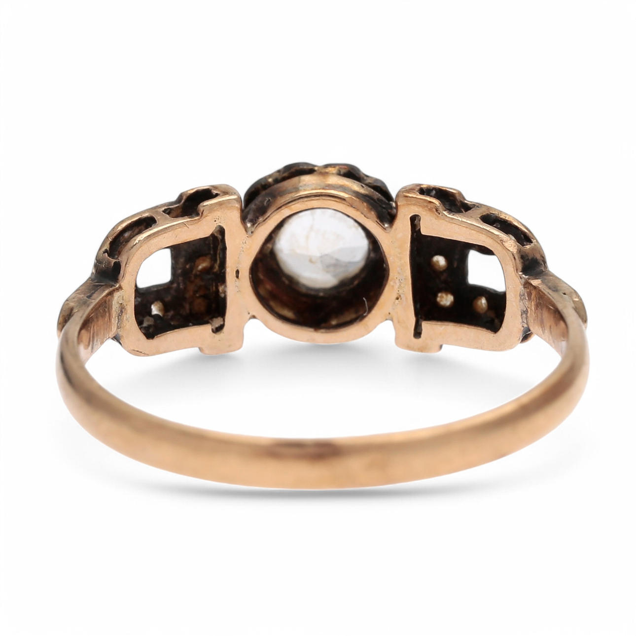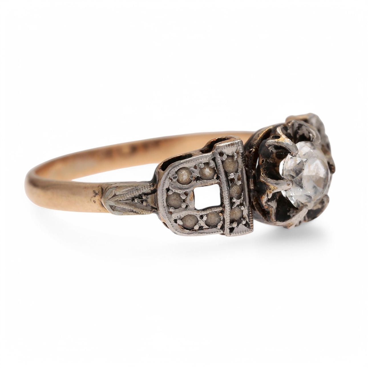 18K gold with platinum views, colourless round cut spinel and colourless rose cut sapphires. Size 15/55. 2.4 gr.