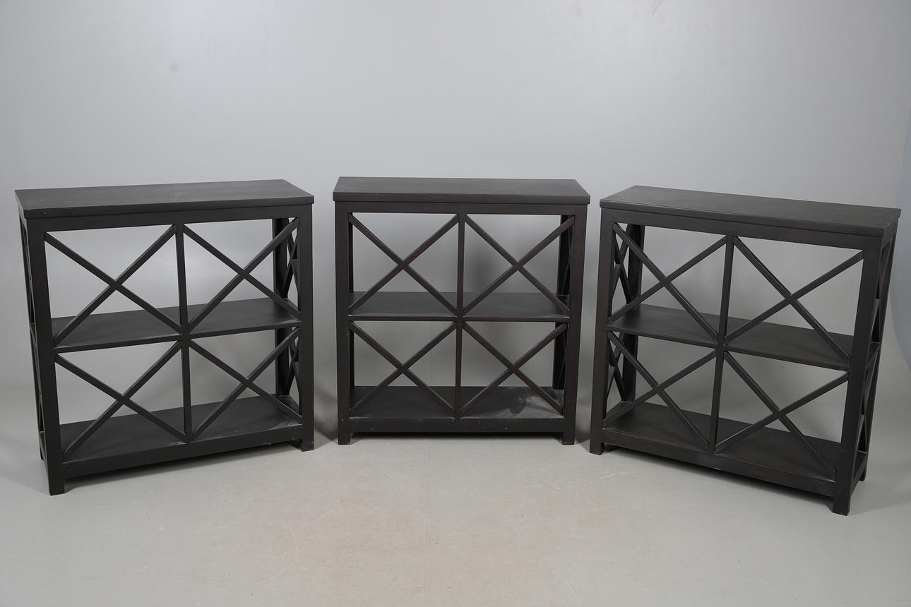A set of three Oka bookcases with a black finish, with X framed supports to the sides and back. 91cms high, 85.5cms across.