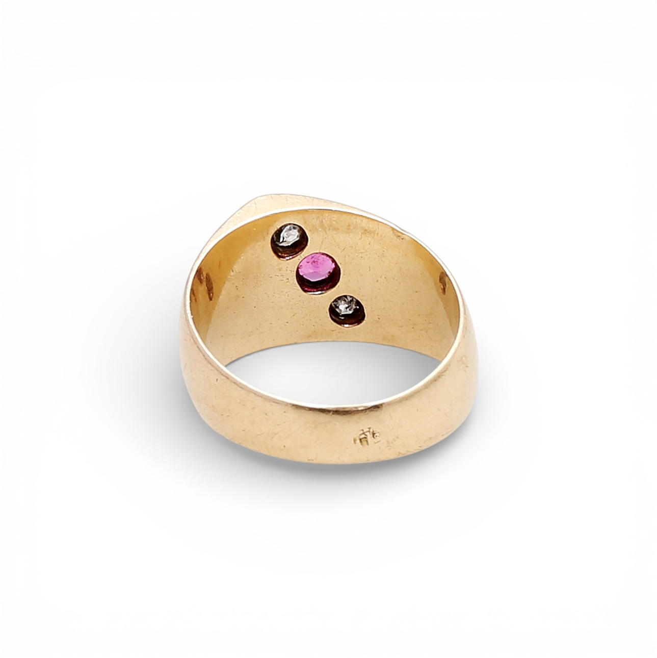18K gold, old brilliant cut diamonds, approx. 0.22 cts., and probably synthetic ruby. Size: 16/56. 8.1 gr.