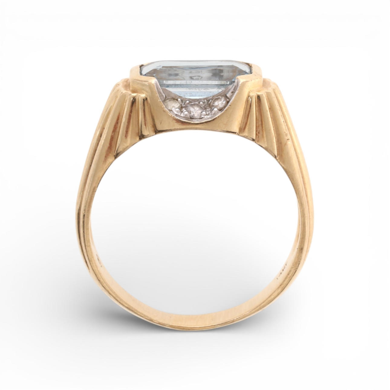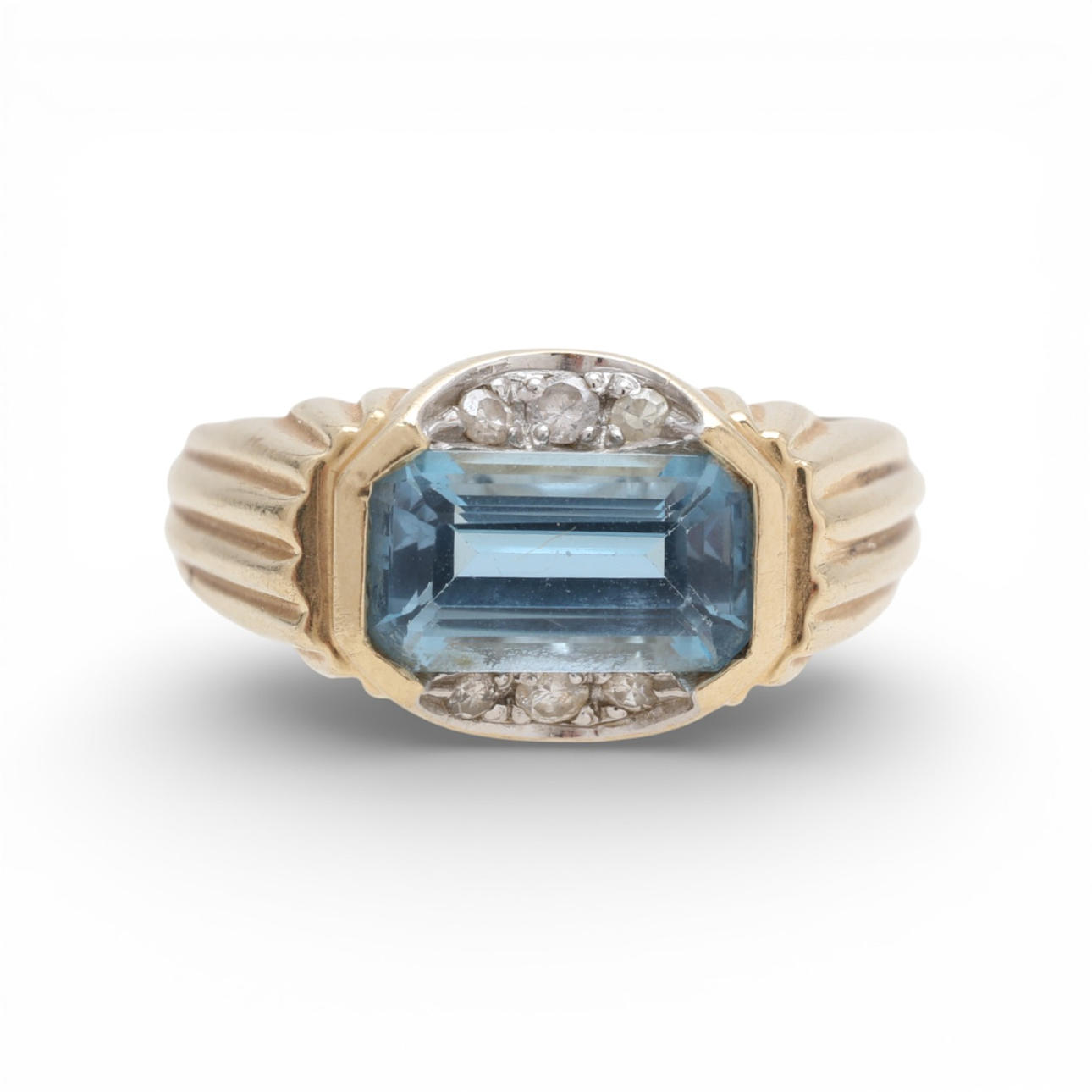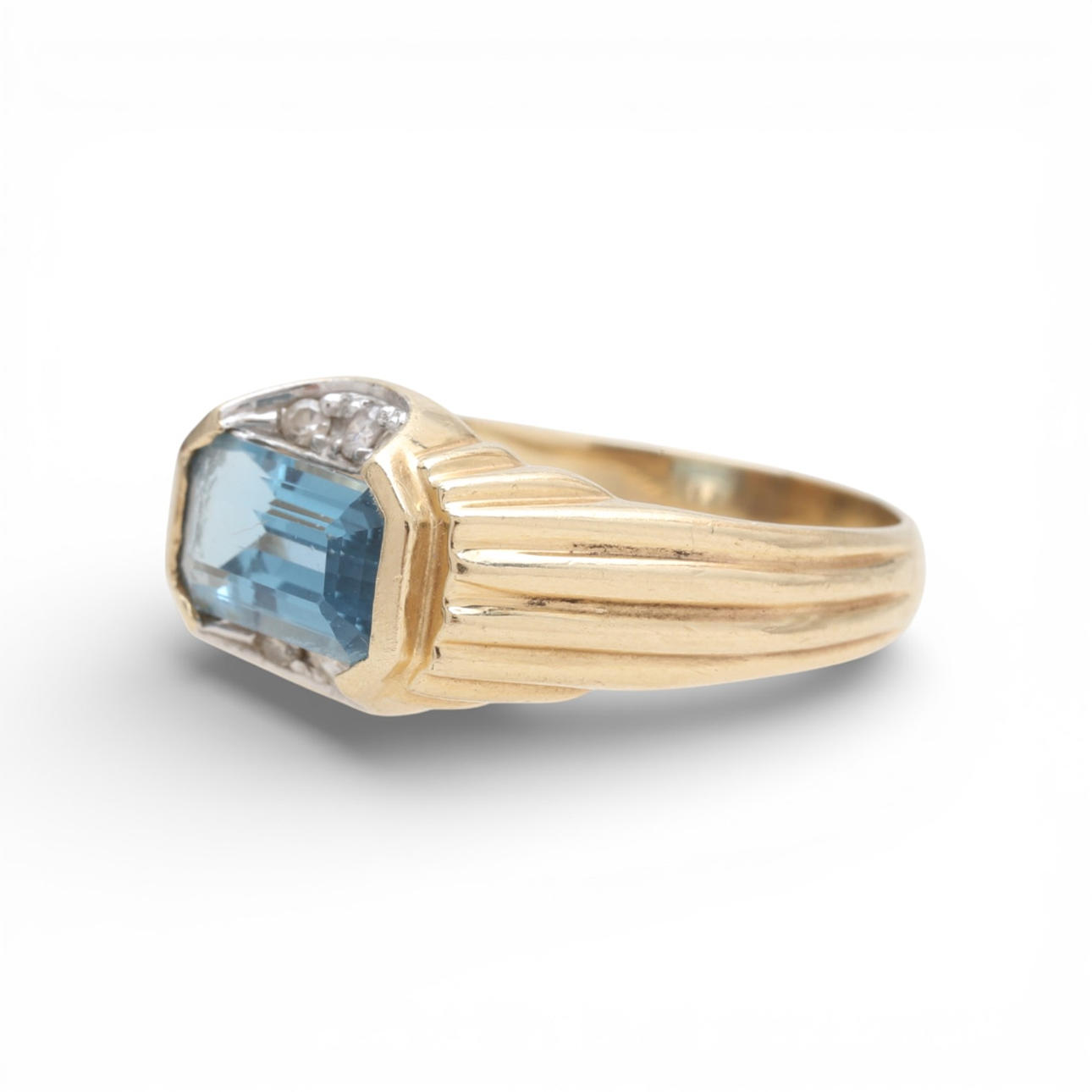 14K gold, emerald cut topaz, approx. 1.93 cts., and brilliant and 8/8 cut diamonds, 0.10 cts approx. Size: 16/56. 4.4 gr.