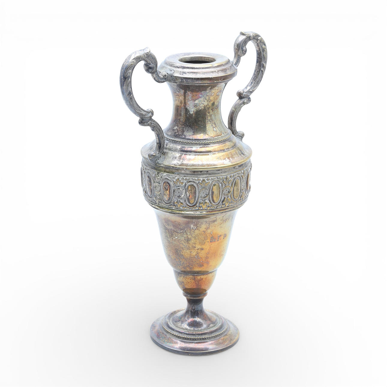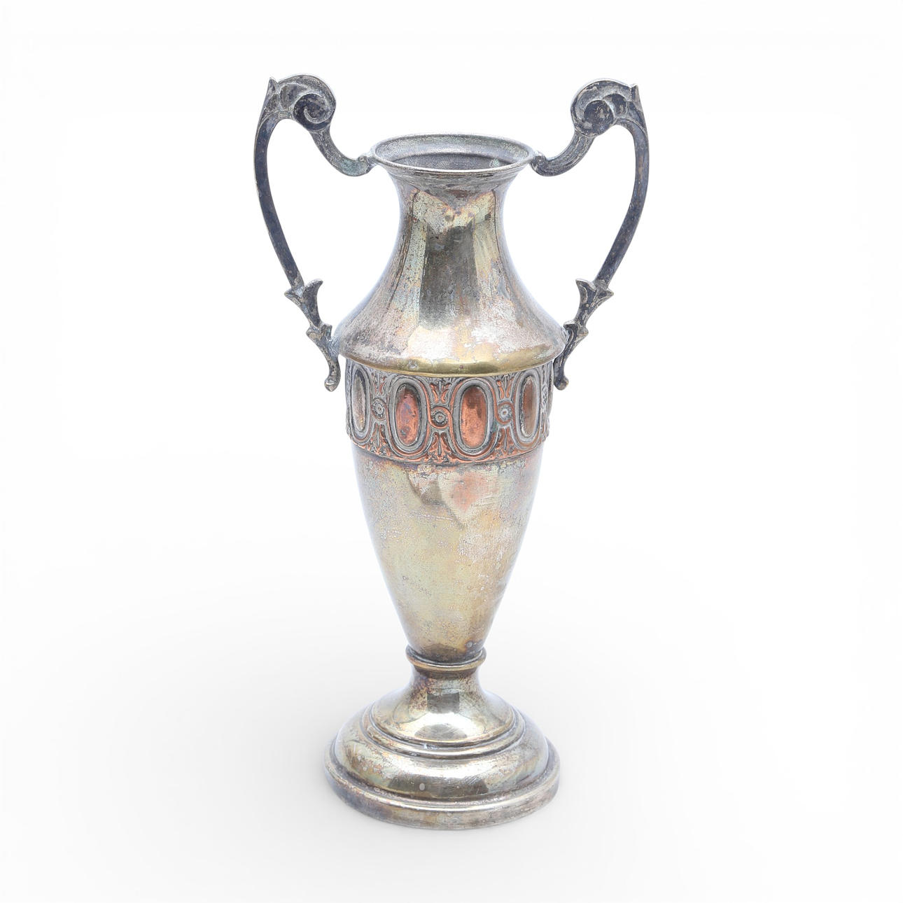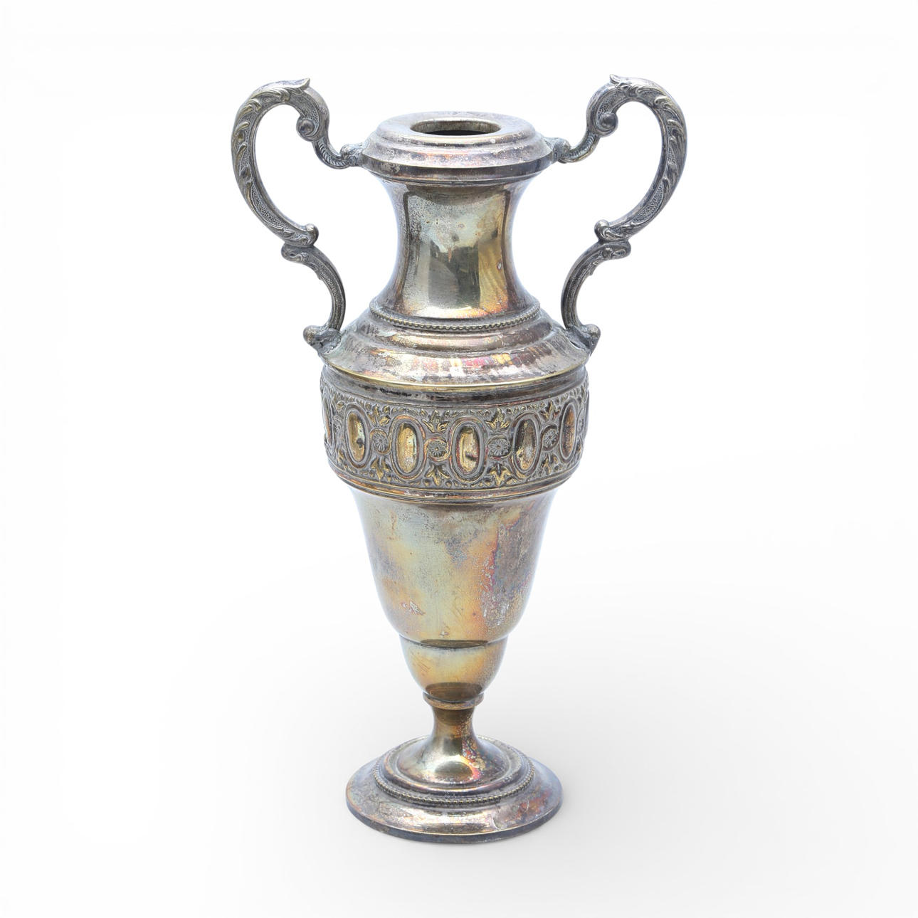 Two silvery metal amphorae.