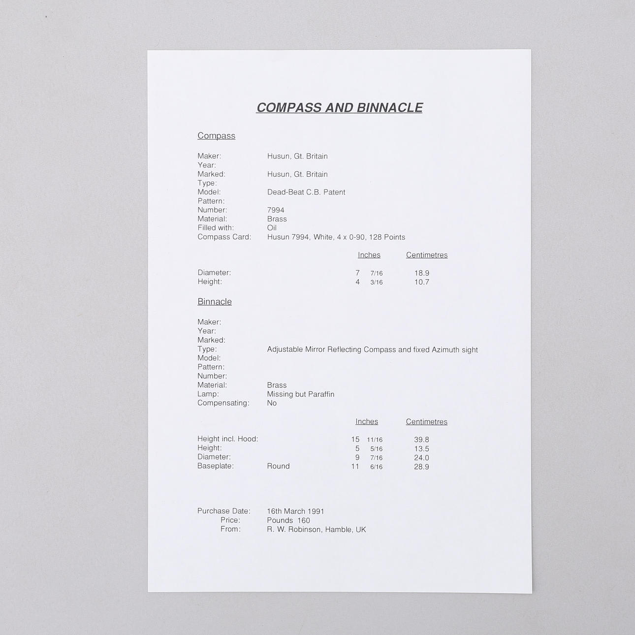 4842951. COMPASS AND BINNACLE, HUSUN, Gt Britain, brass.