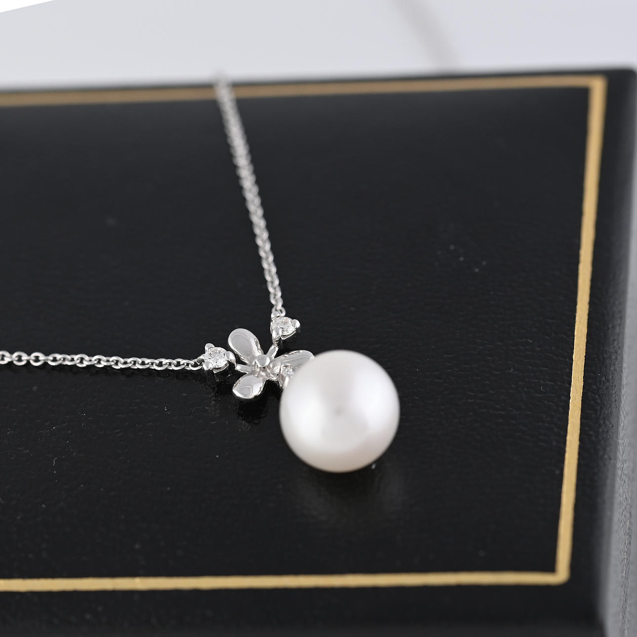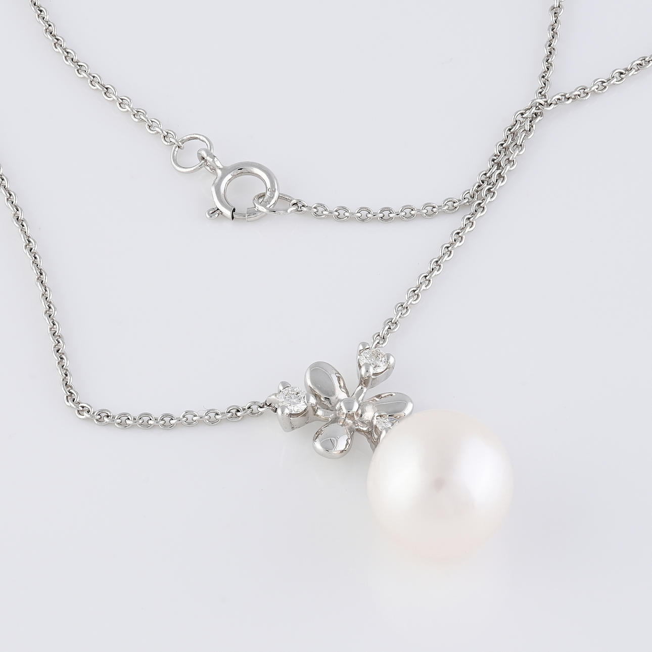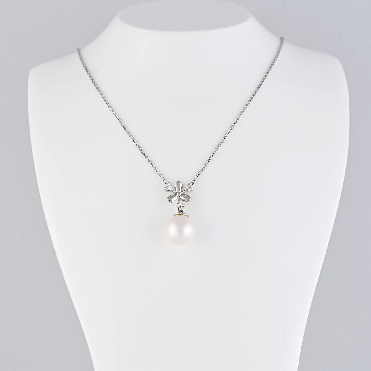 A white gold necklace with integral pendant set with pearl and diamonds, with gifting box