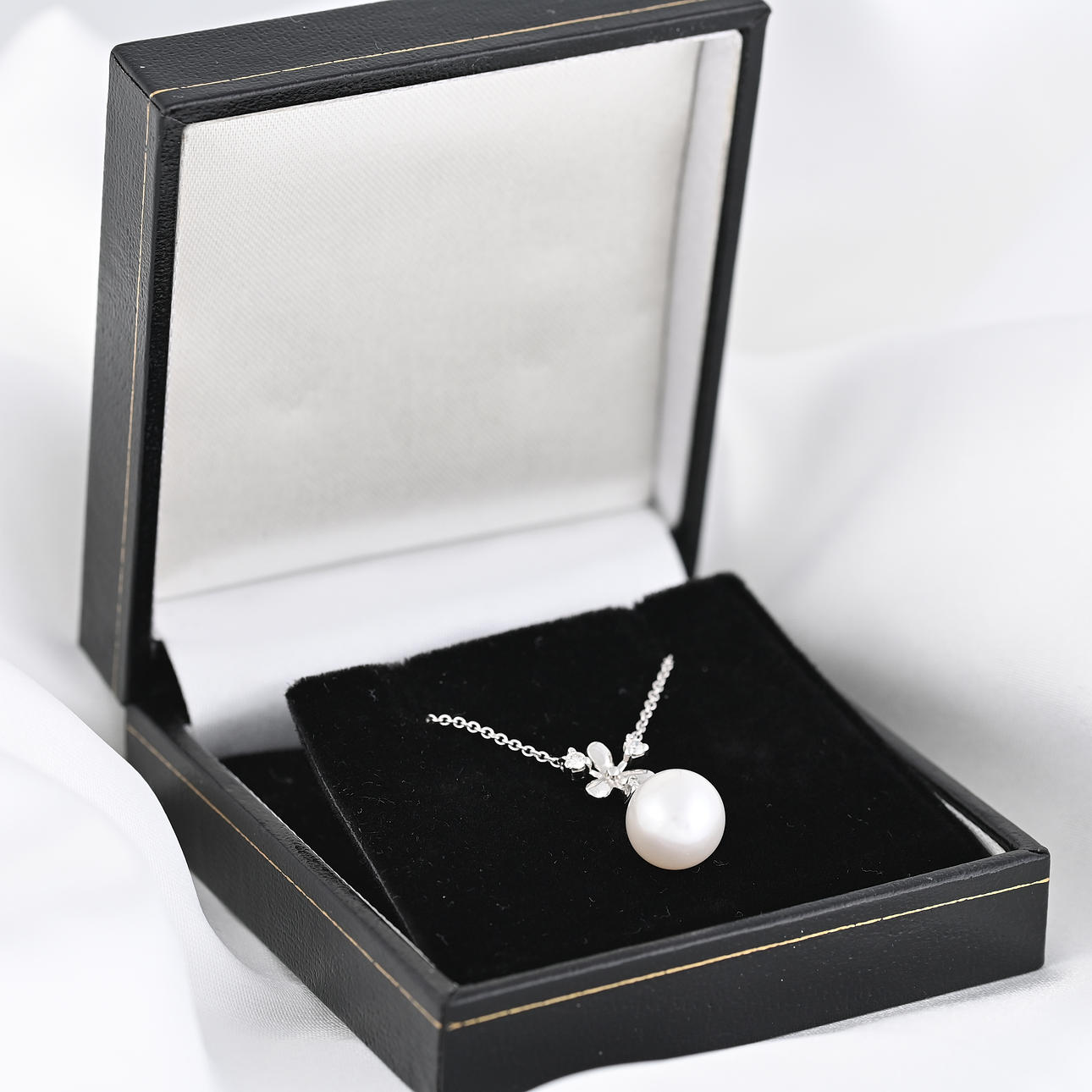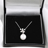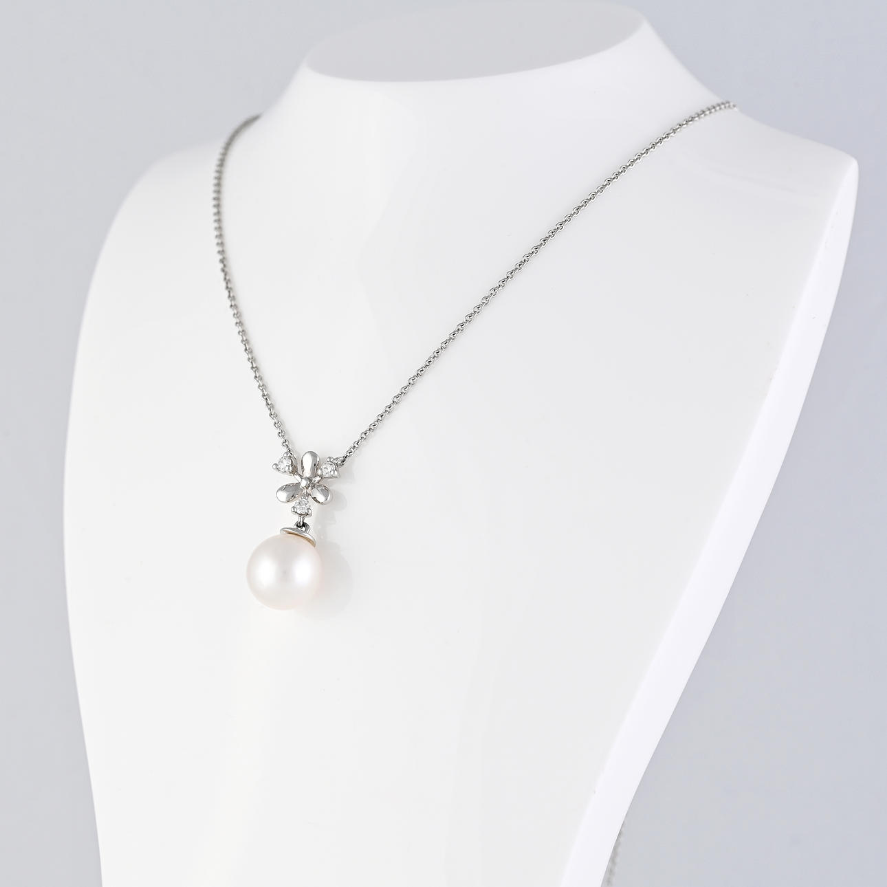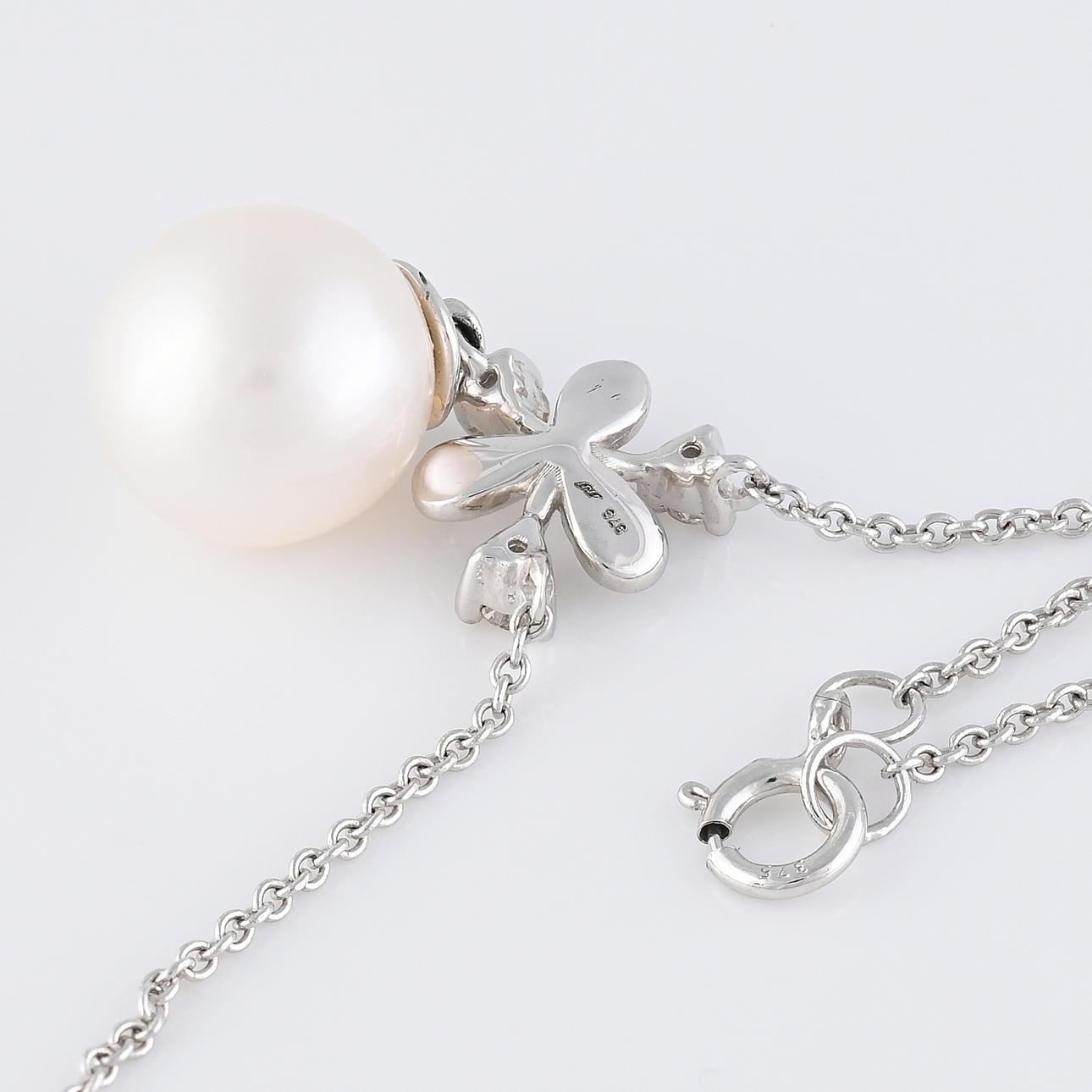 A white gold necklace with integral pendant set with pearl and diamonds, with gifting box