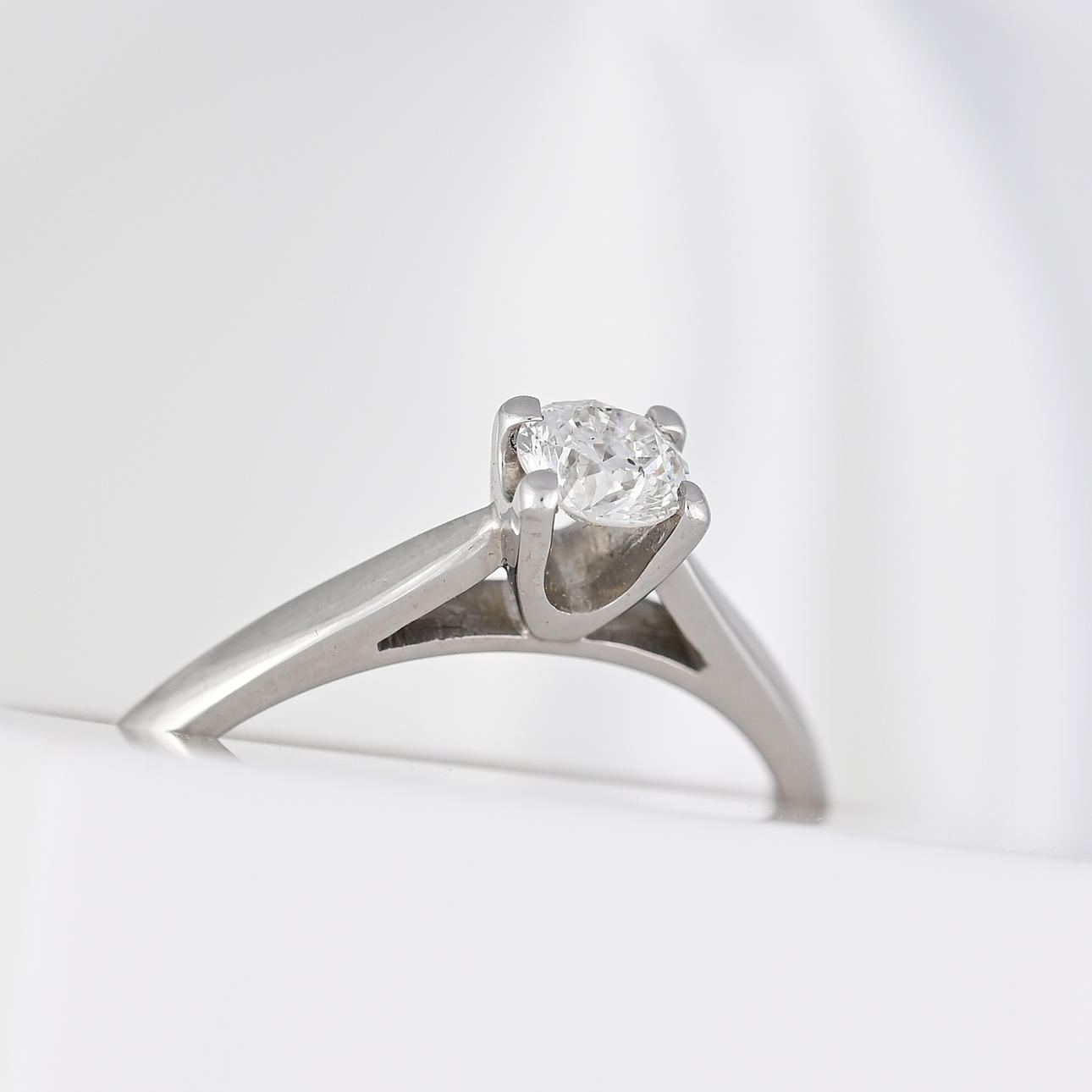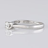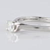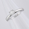An 18k white gold ring set with a solitaire diamond. Additionally, this ring has another diamond set inside the shank in the "O" of "FOREVER"