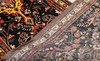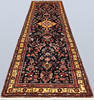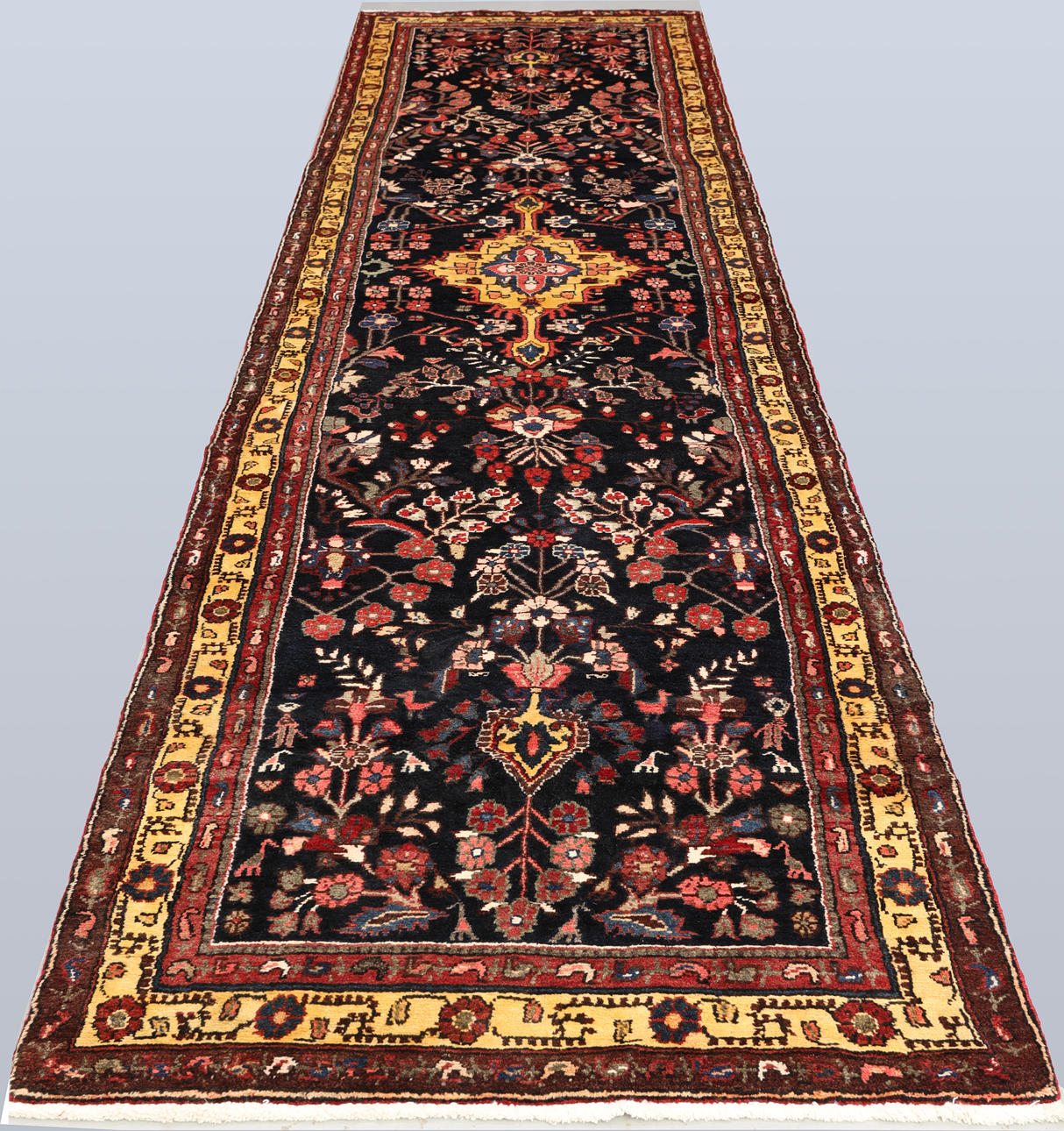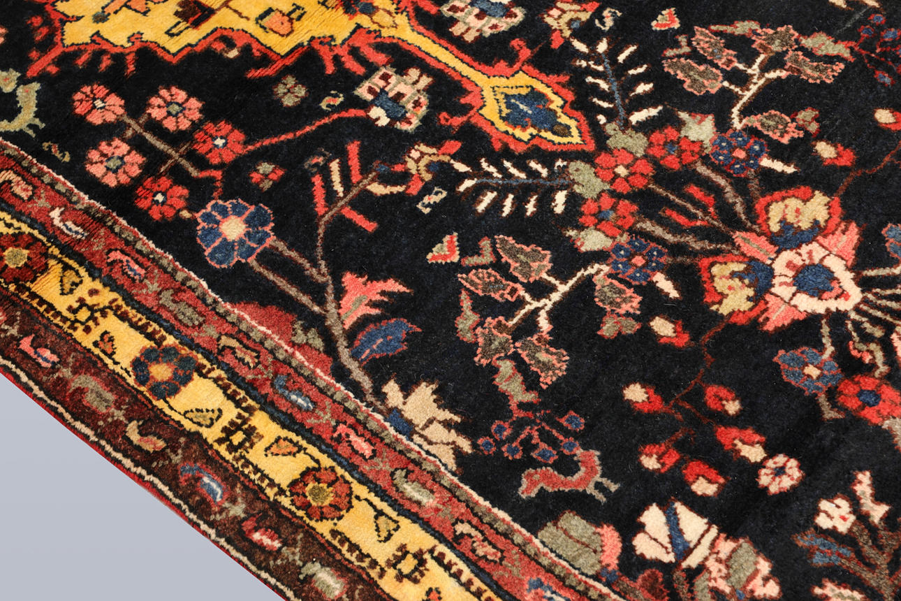 Hamadan gallery model with dark bottom color and decor of a geometric medallion combined with stylized floral decor in red, yellow and blue tones. The border has a yellow base and decor of geometric and flower-shaped motifs. The forelock is made of wool and the warp is of cotton.