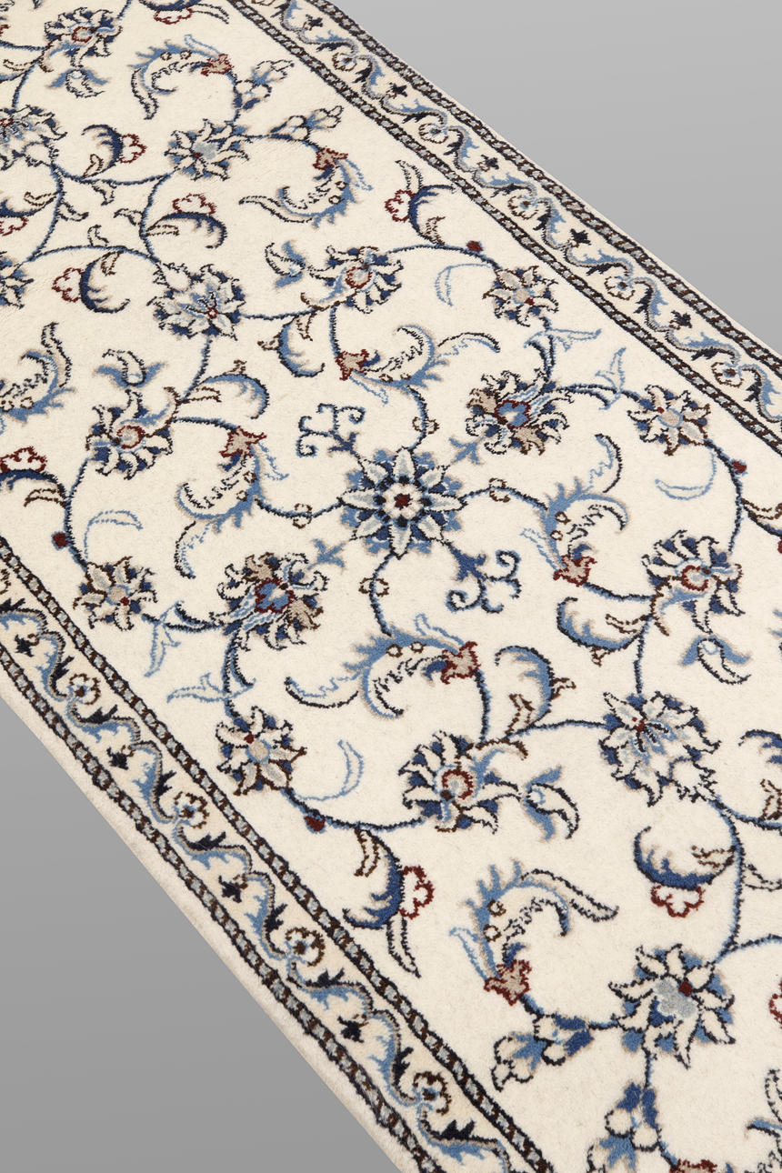 Nain gallery model with light base color and decoration of palmettes and arabesques in blue and beige tones. The border has bright bottom and floral decor in matching color scheme. The forelock is made of wool and the warp is of cotton.