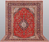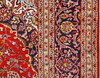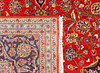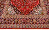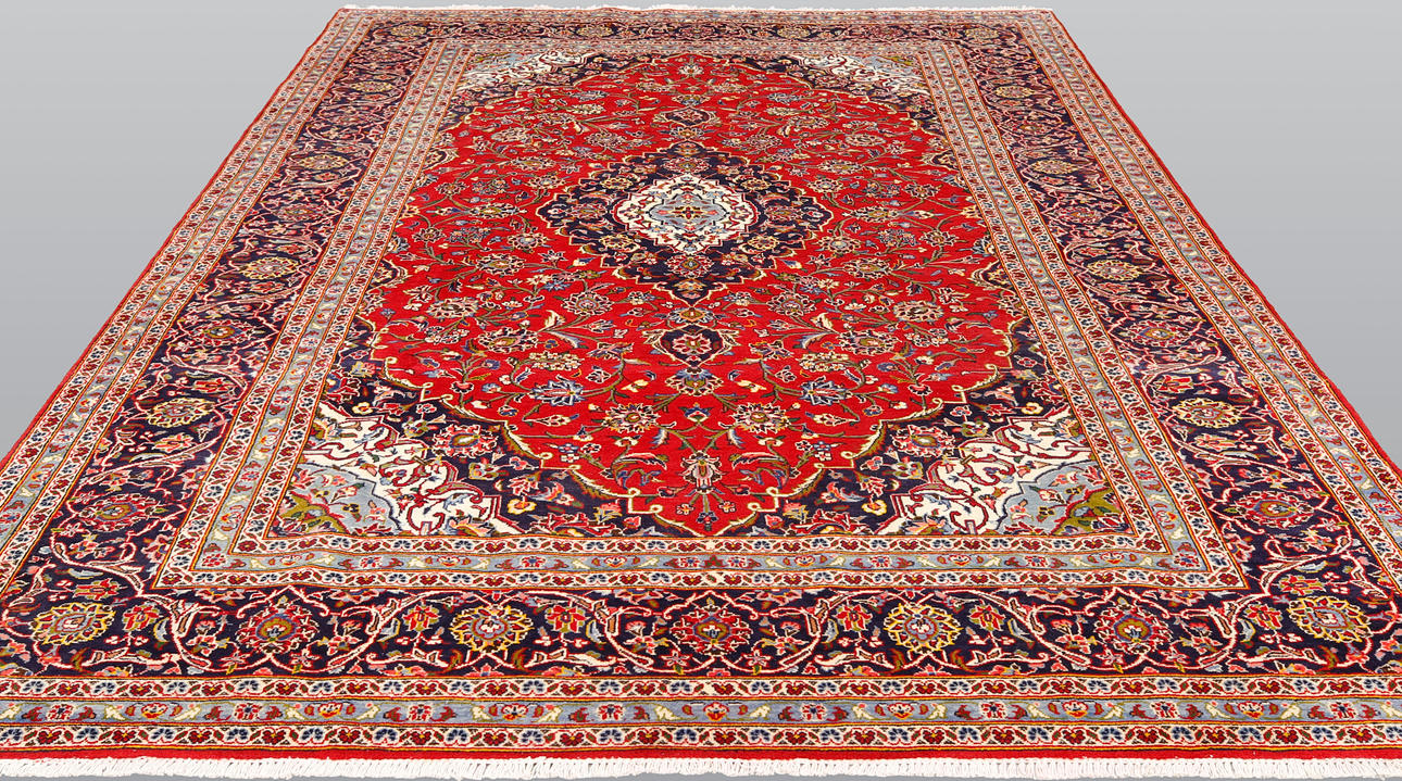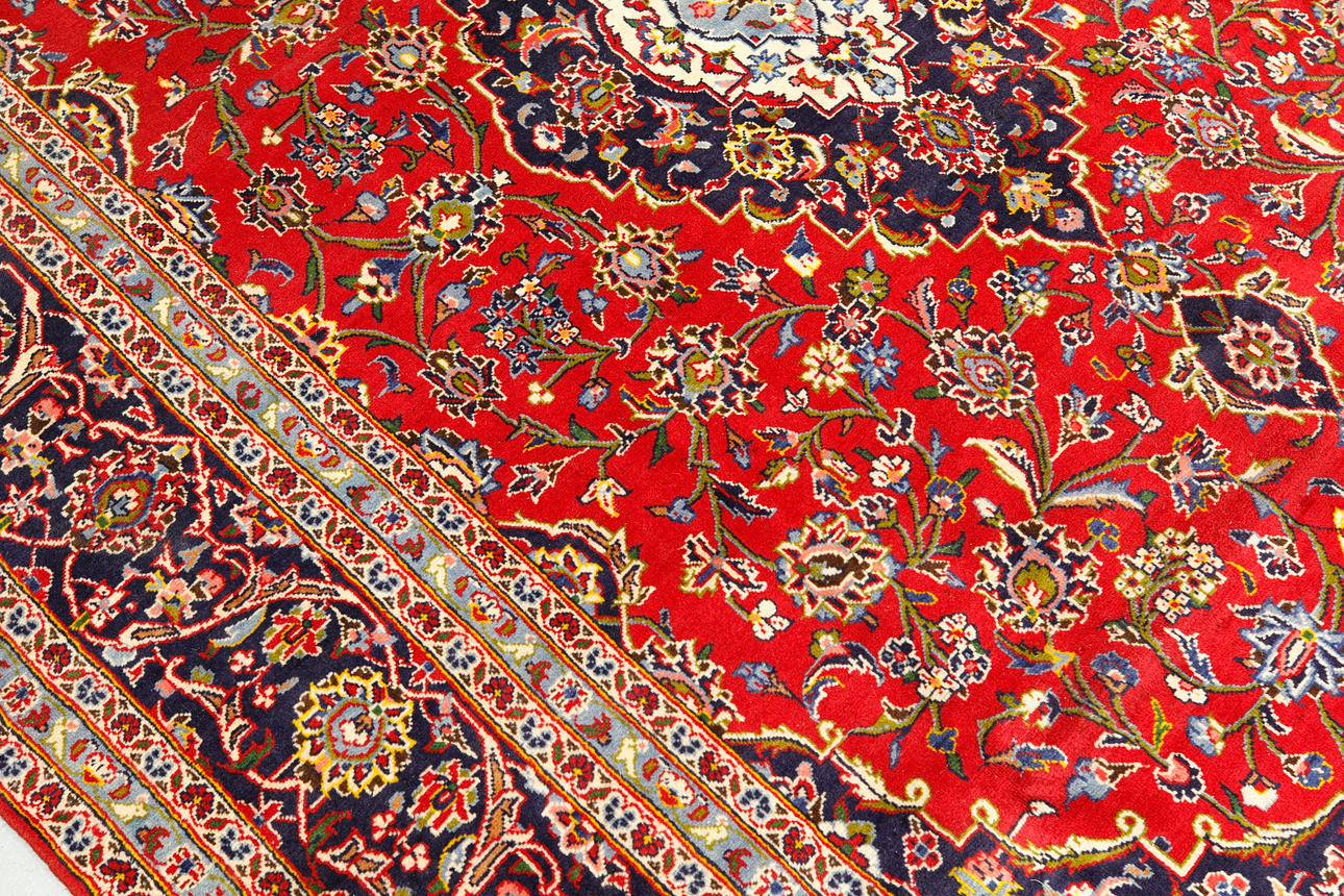 Keshan with a red bottom color and a centrally placed medallion with details in blue, beige and green. The center field is covered in floral ornamentation, palmettes and arabesques in similar shades, and the corner portions follow the same pattern structure. The border has a dark bottom and decor of palm branches. The forelock is made of wool and the warp is of cotton.