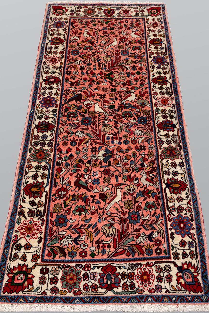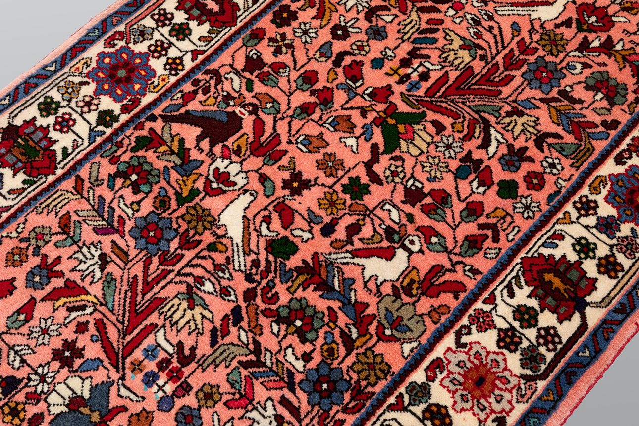 Figural Kolyay with pink base and a figural pattern consisting of stylized flowers, birds and plant ornaments in red, blue, green and beige. The border is bright with floral decor framing the center field. The forelock is made of wool and the warp is of cotton.
