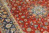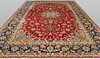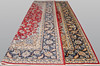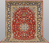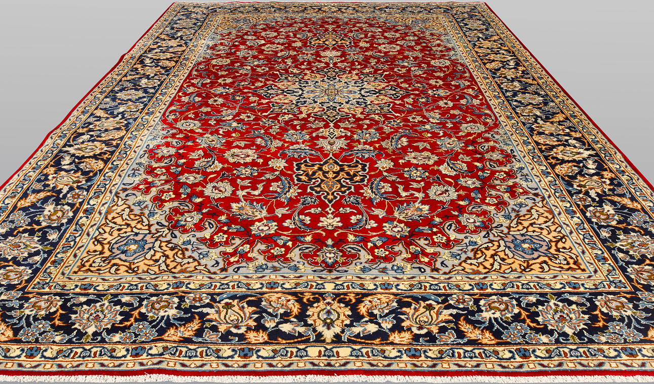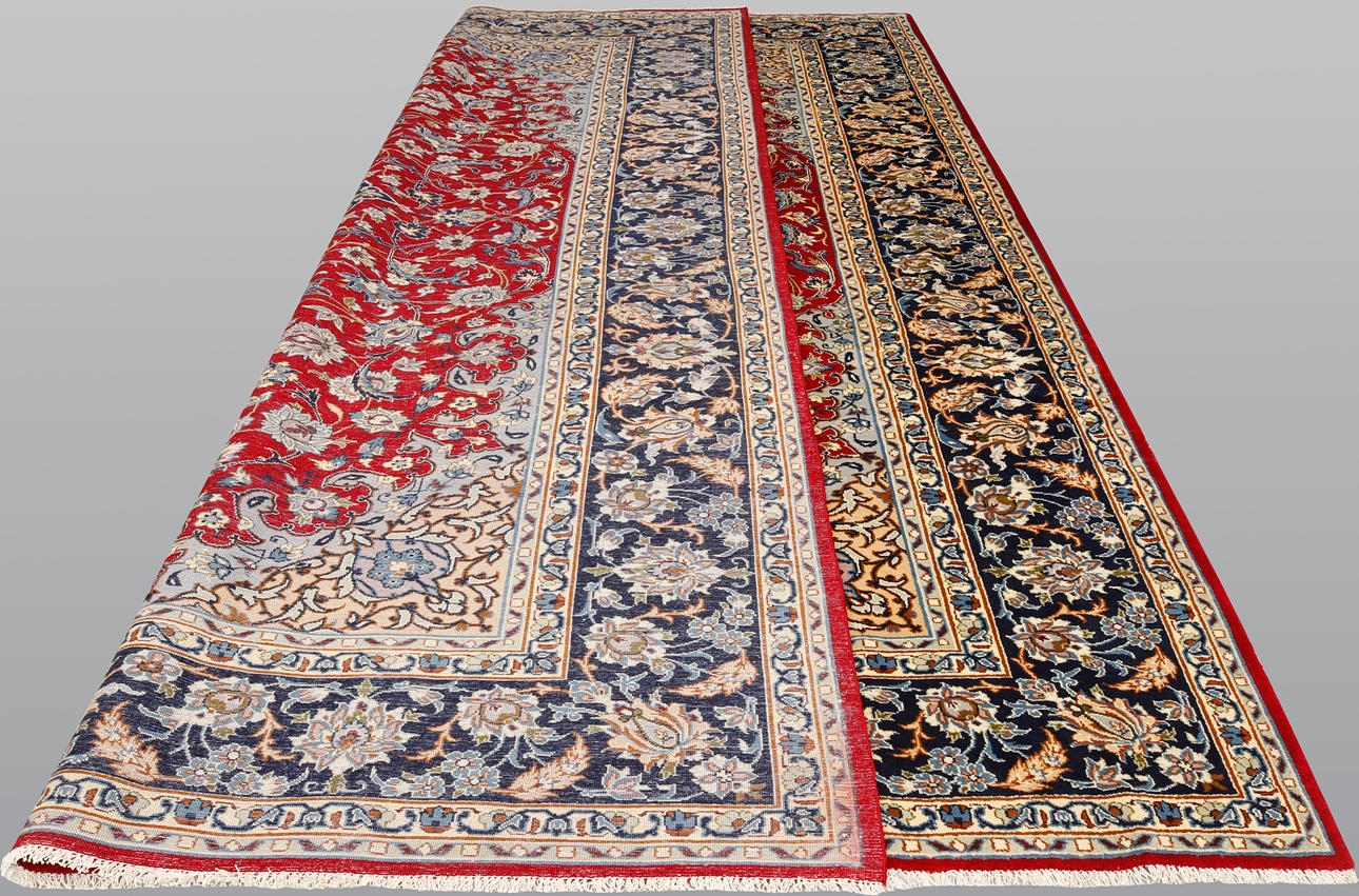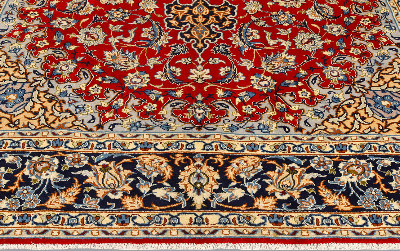 Nadjafabad with a red background and a floral-ornamented centre field surrounding a central medallion in blue, beige and light tones. The border has a dark bottom color with decoration of palm branches. The forelock is made of wool and the warp is of cotton.