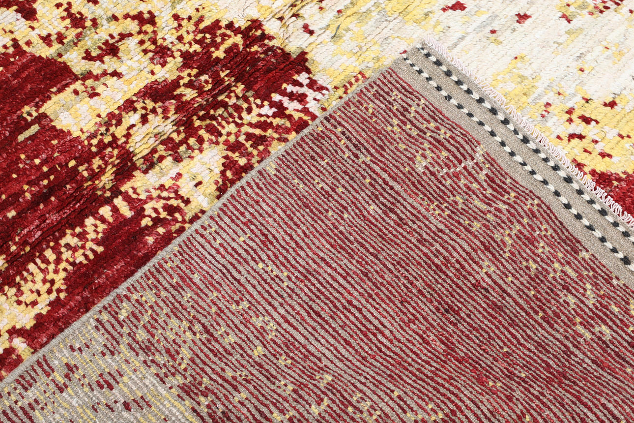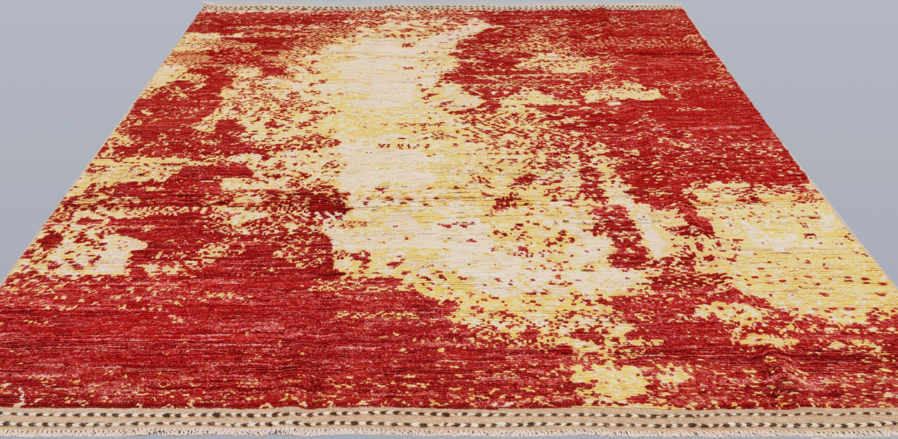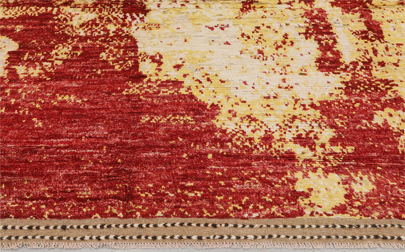 Morocco design with abstract pattern in different shades of red and yellow. The forelock is made of wool and the warp is of cotton.