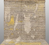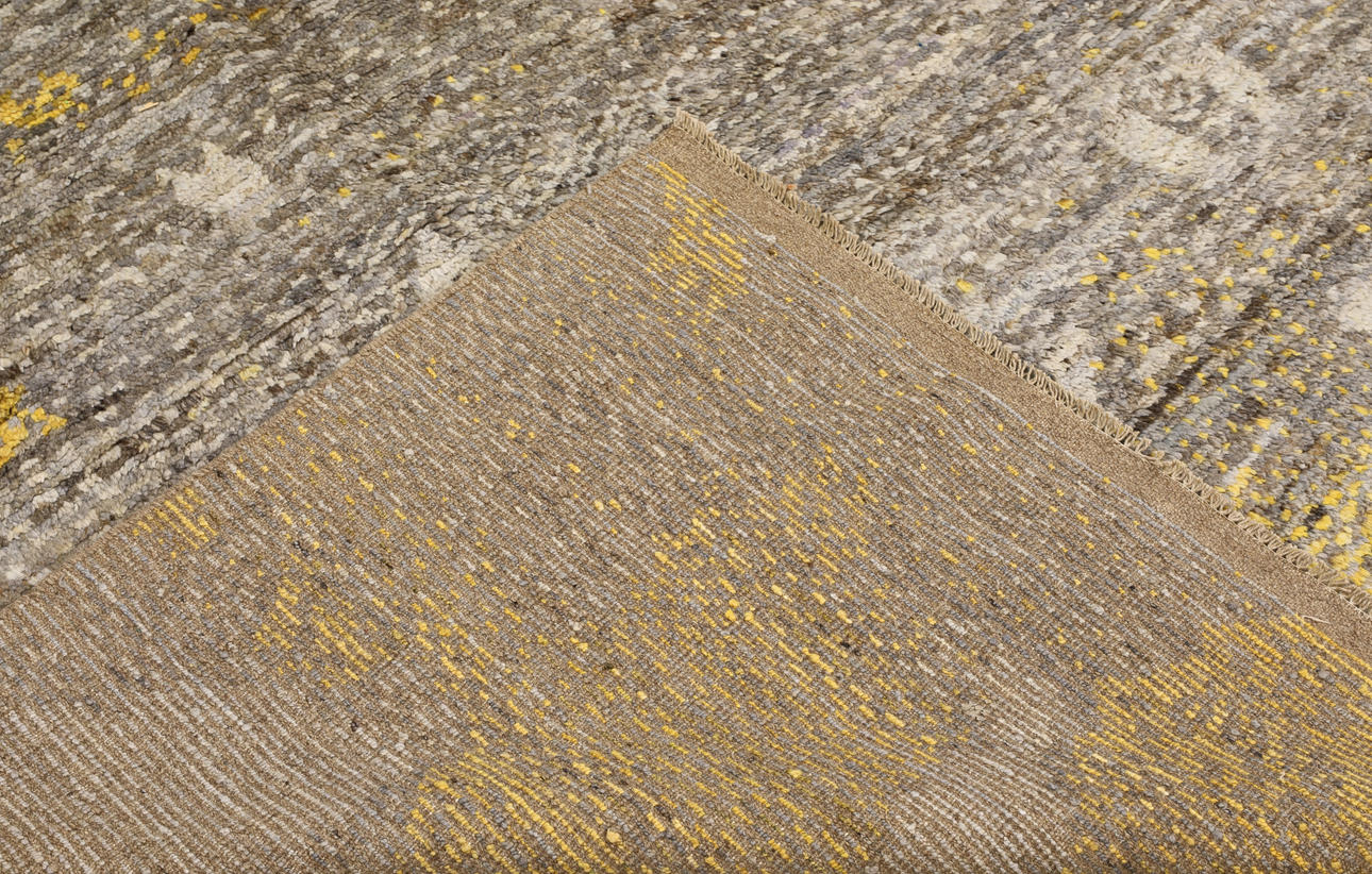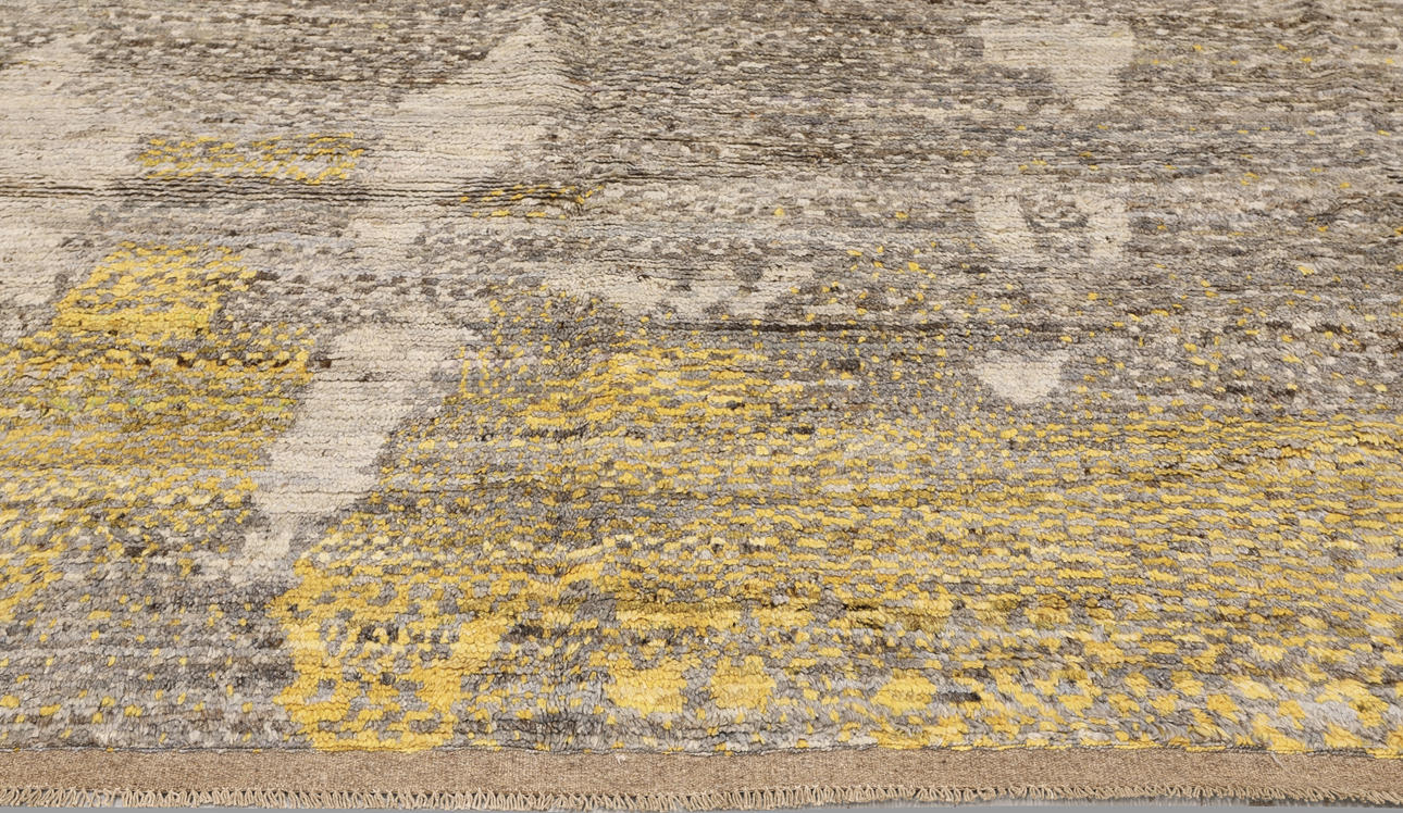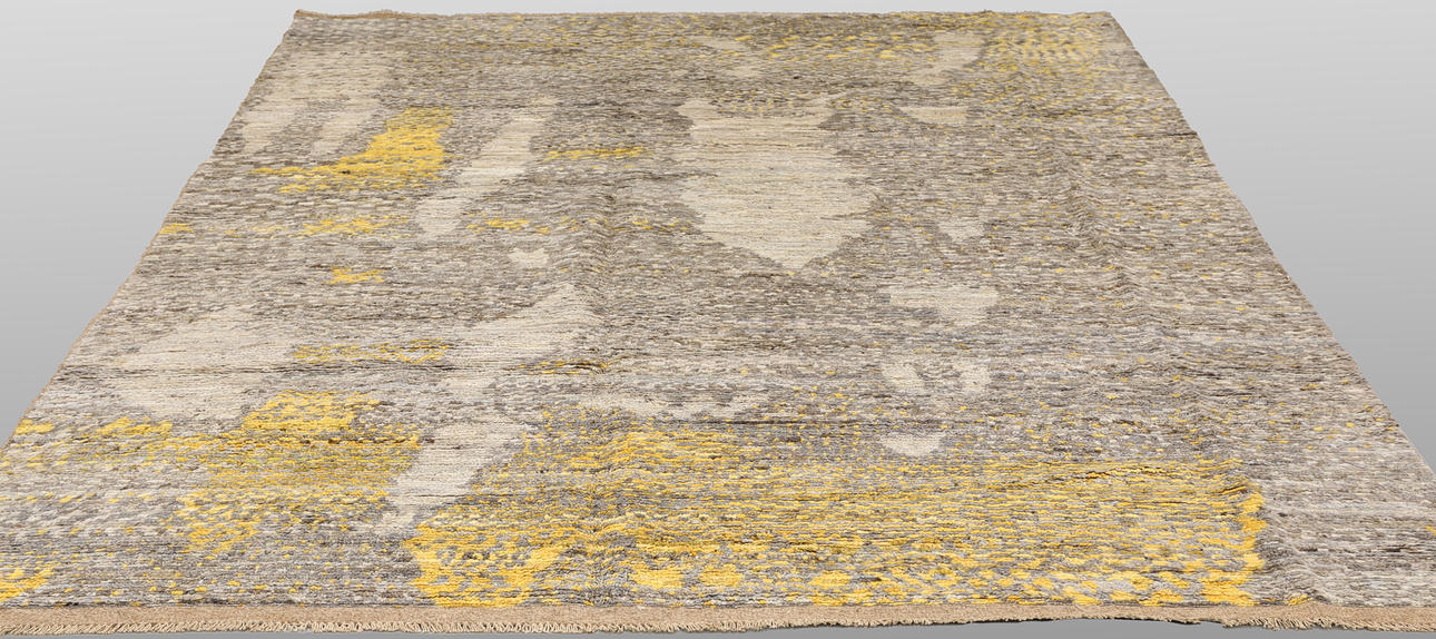 Morocco design with abstract pattern in gray and beige tones, accentuated by touches of yellow. The bangs are made of wool and the warp is of cotton.