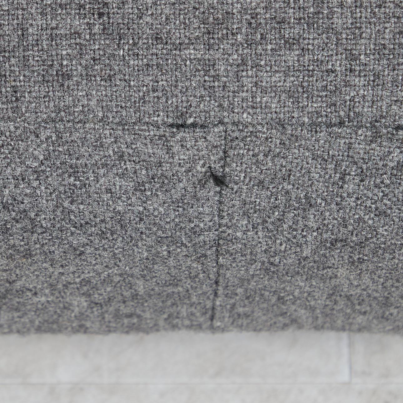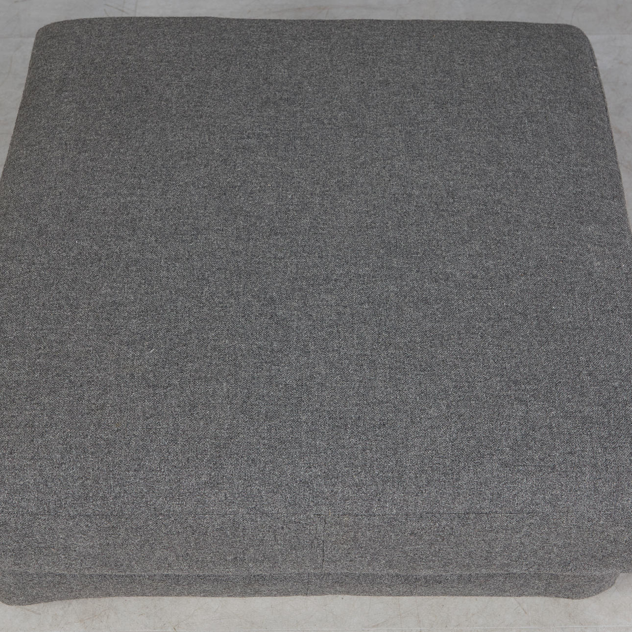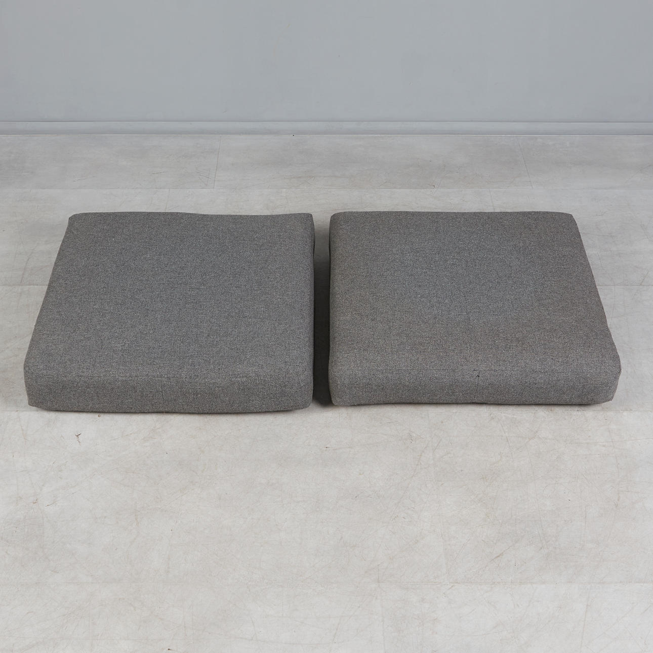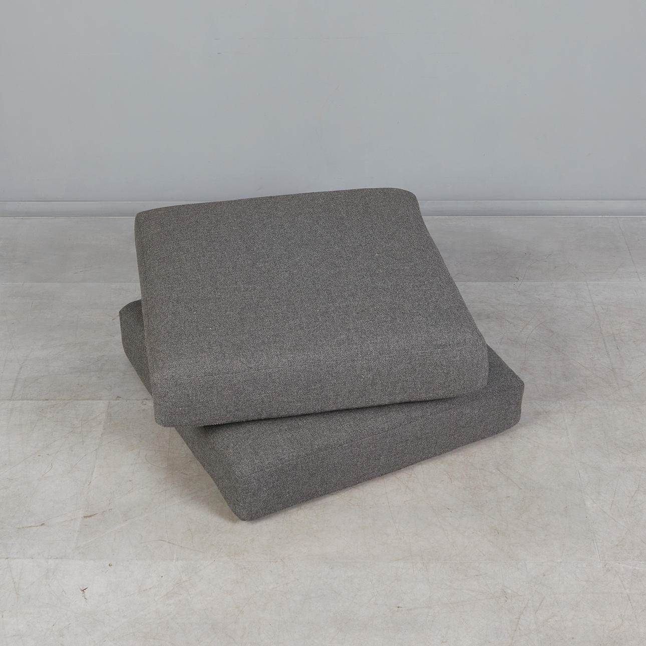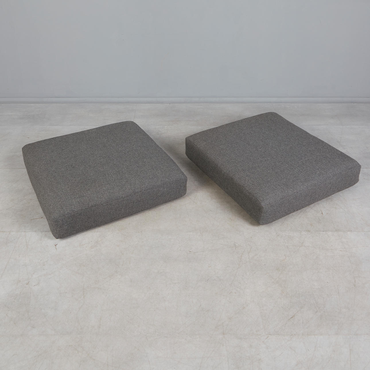 Two square seat cushions with spring core and grey wool upholstery, dimensions each: H.18cm, L.82cm, W.82cm. (2).