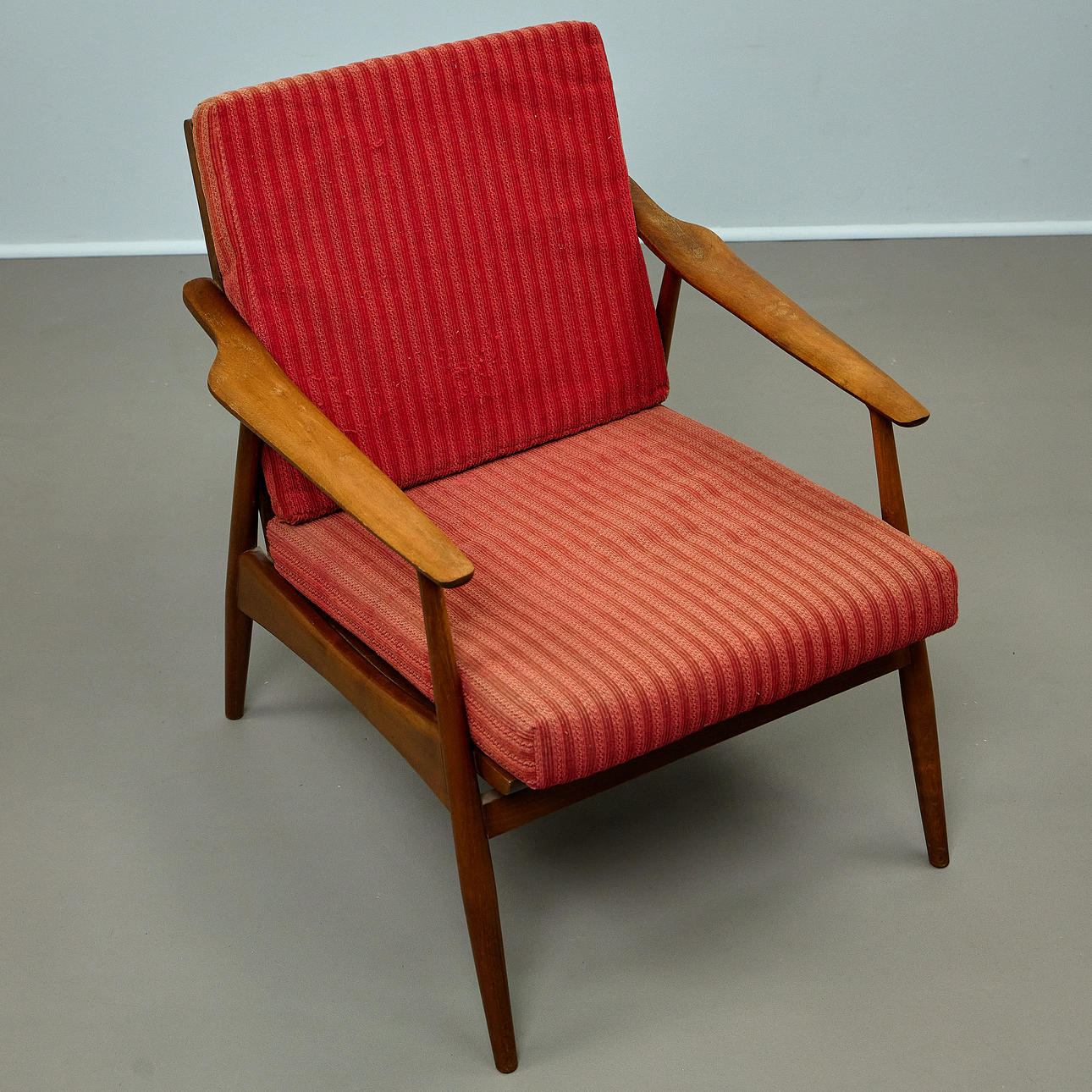 Signs of wear and tear due to age and use. Wood surfaces with corresponding signs of wear. Upholstery with color differences and stains.