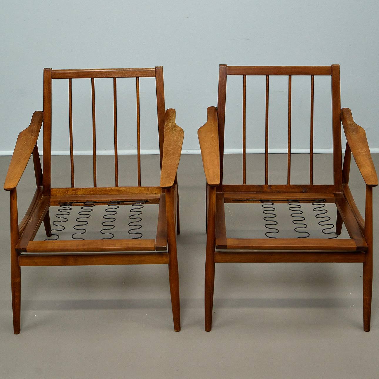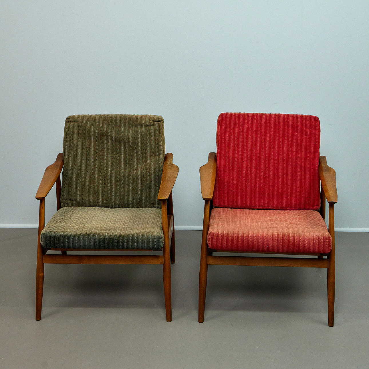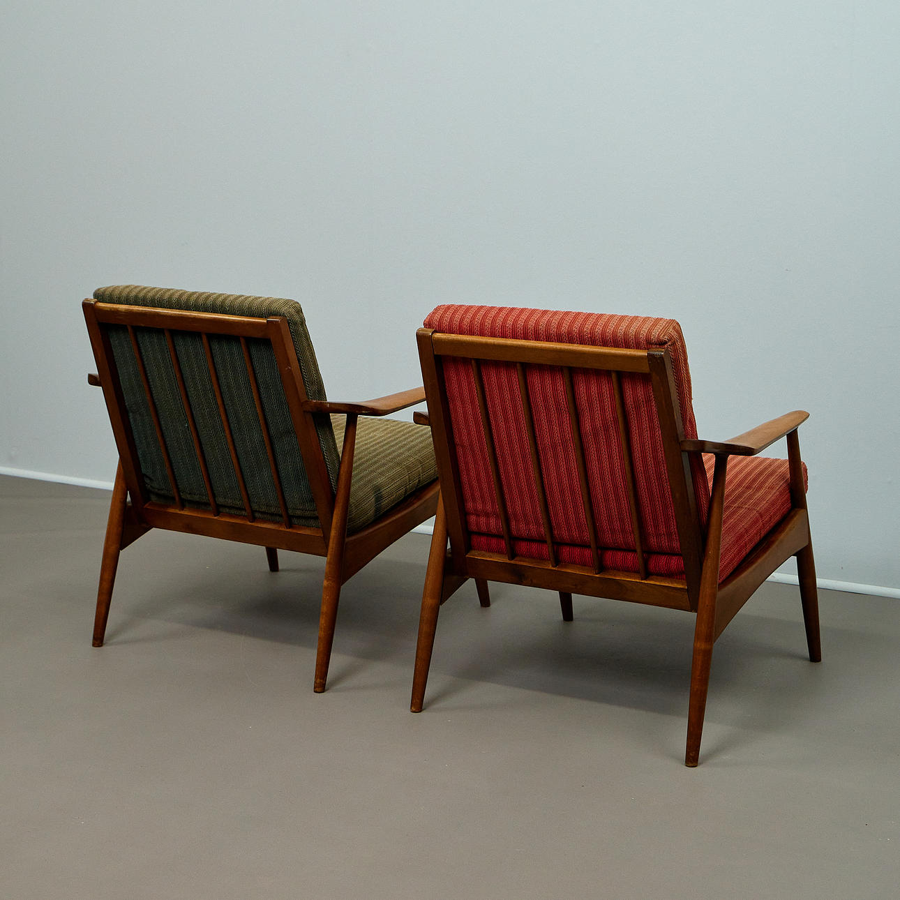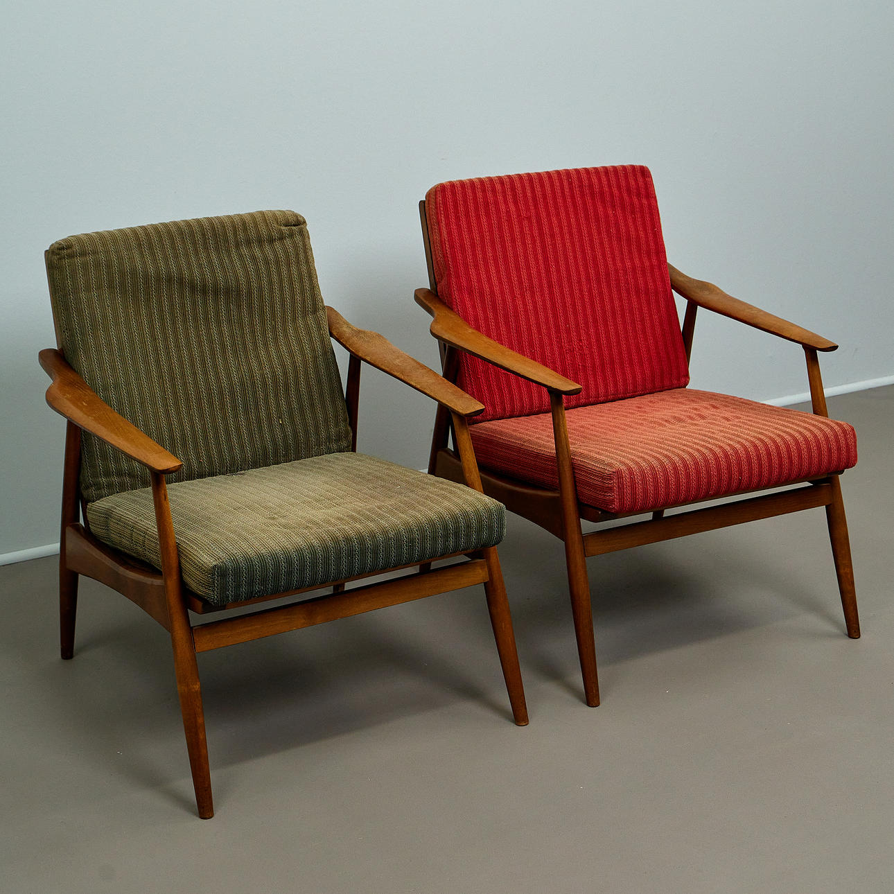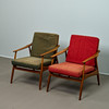 A pair of lounge chairs with a clear, functional design language. Beech wood frame with slightly flared legs and curved armrests. Loosely placed seat and back cushions