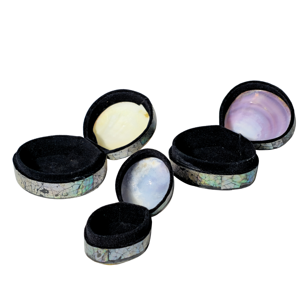 Black velvet interior. Different shells, including shell with pearl mabe, mother-of-pearl, “codakia” shell, etc. Between 13 and 5 cm Different sizes.