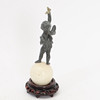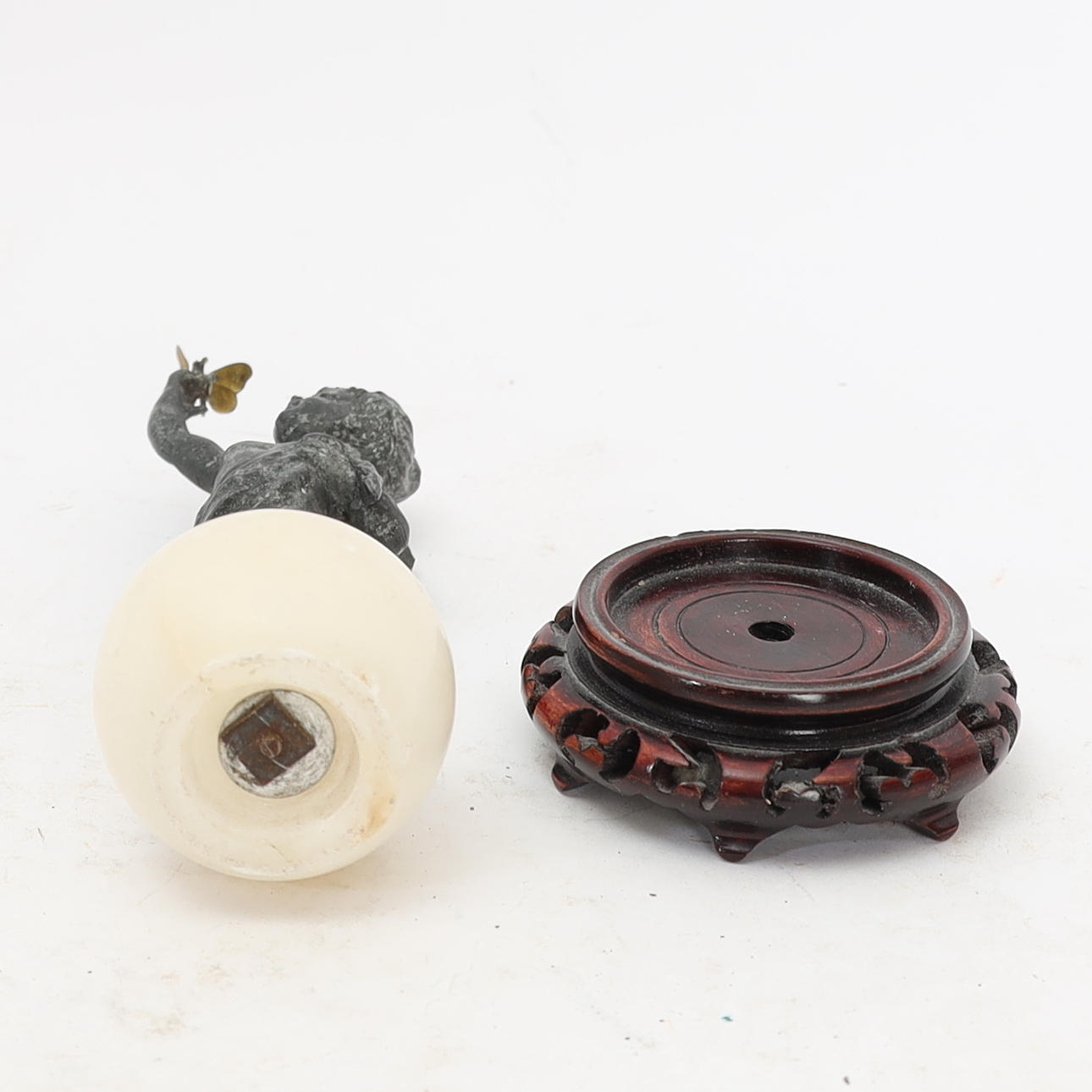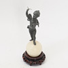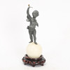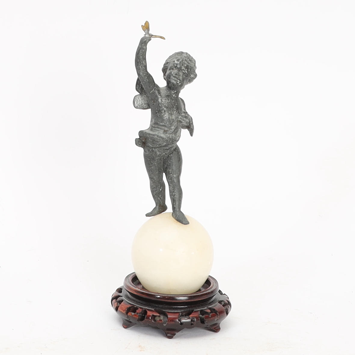 Mounted on orbs of stone. Loose plinth made of cut wood. Sculpture of patinated metal. Height 19,5cm.