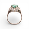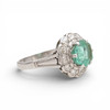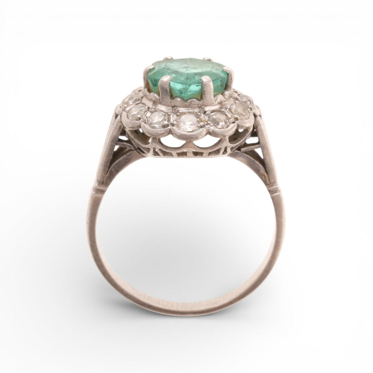 18K white gold, hexagonal cut emerald, approx. 1.60 cts., and old brilliant and 16/16 cut diamonds, approx. 0.66 cts. size 17/57. 6.1 gr.