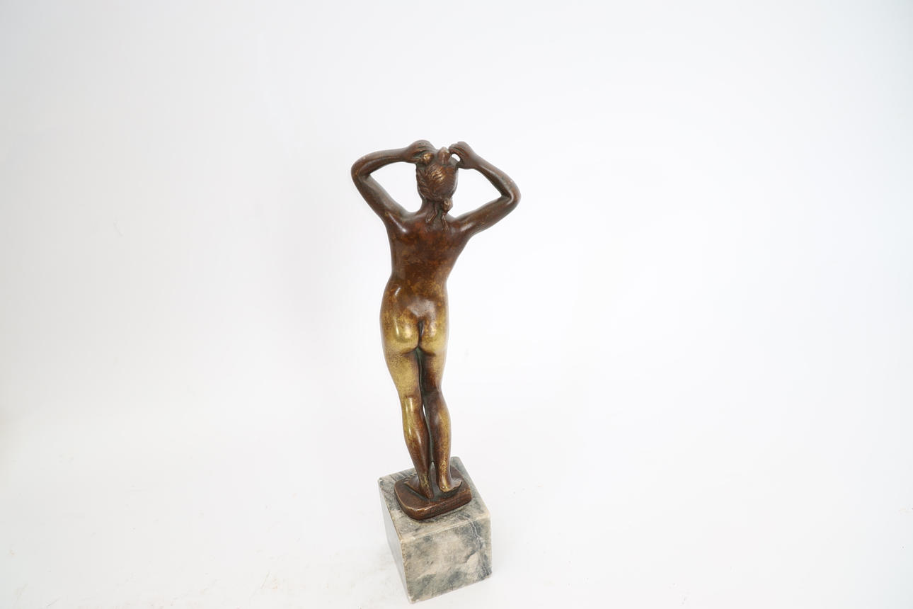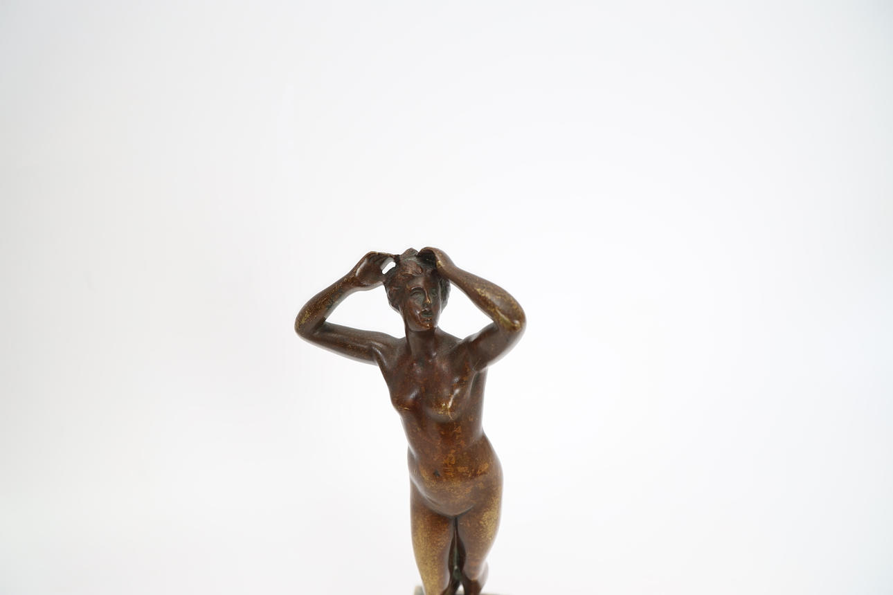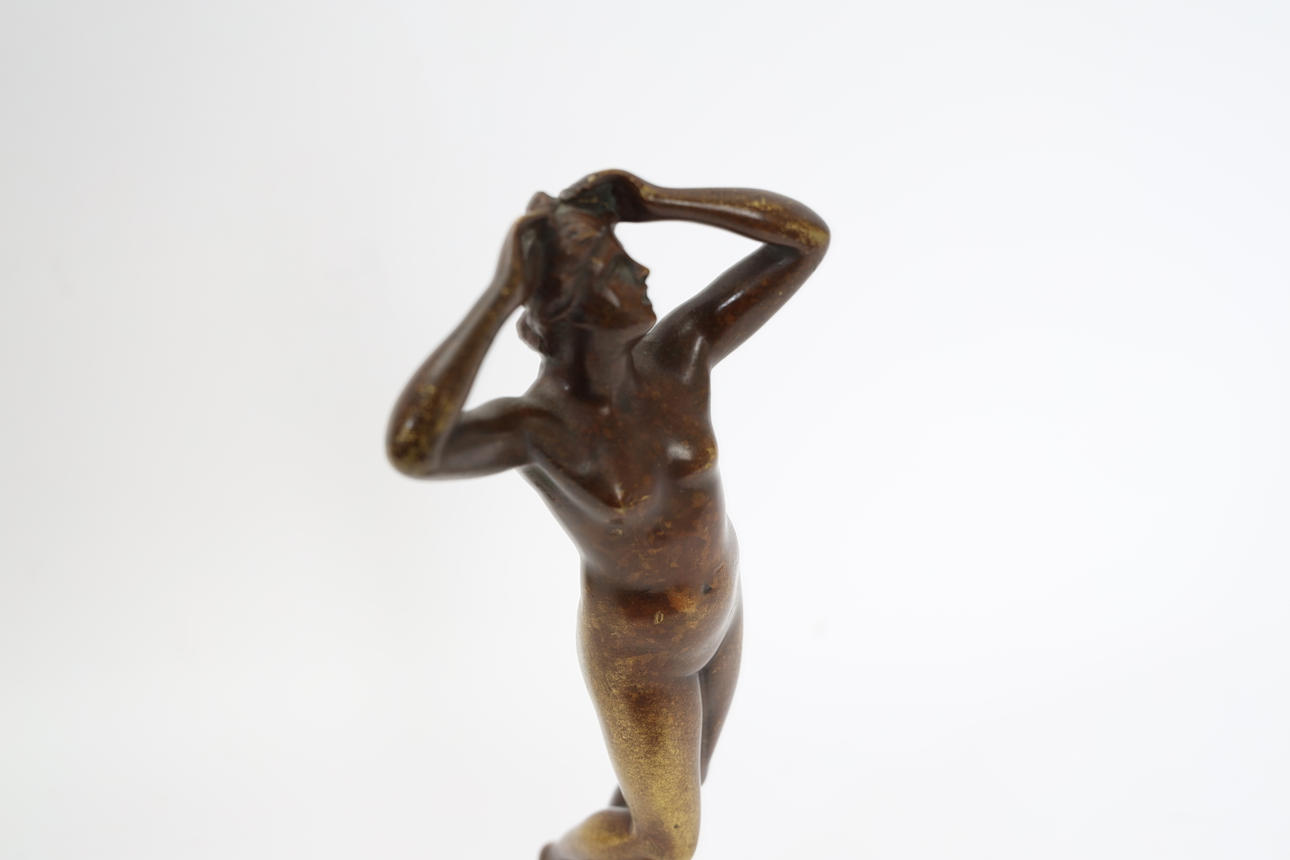 Bronze, mounted on marble plinth. Posing woman. Signed. Height 30,5cm.