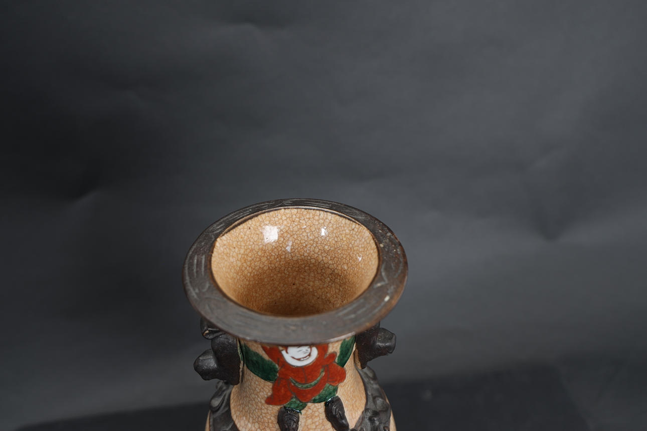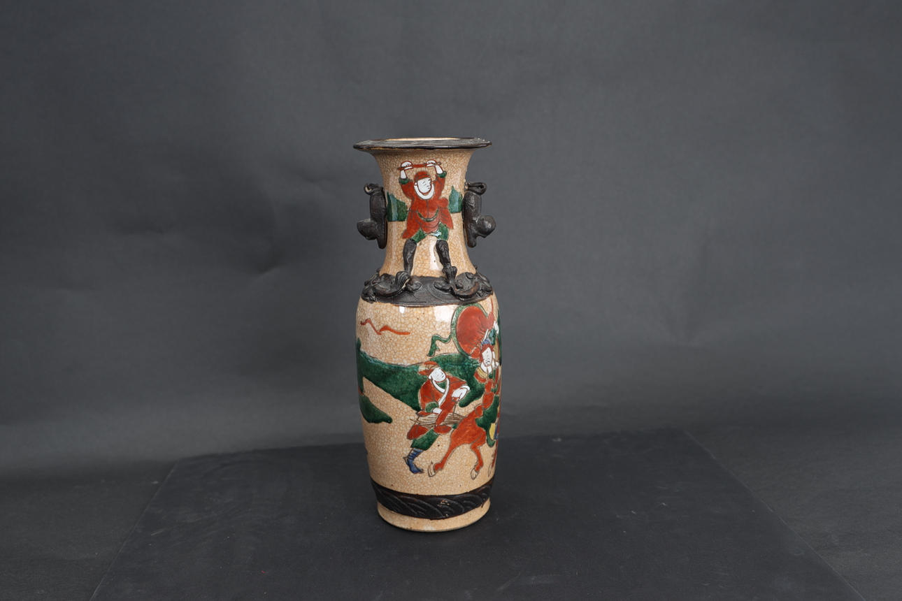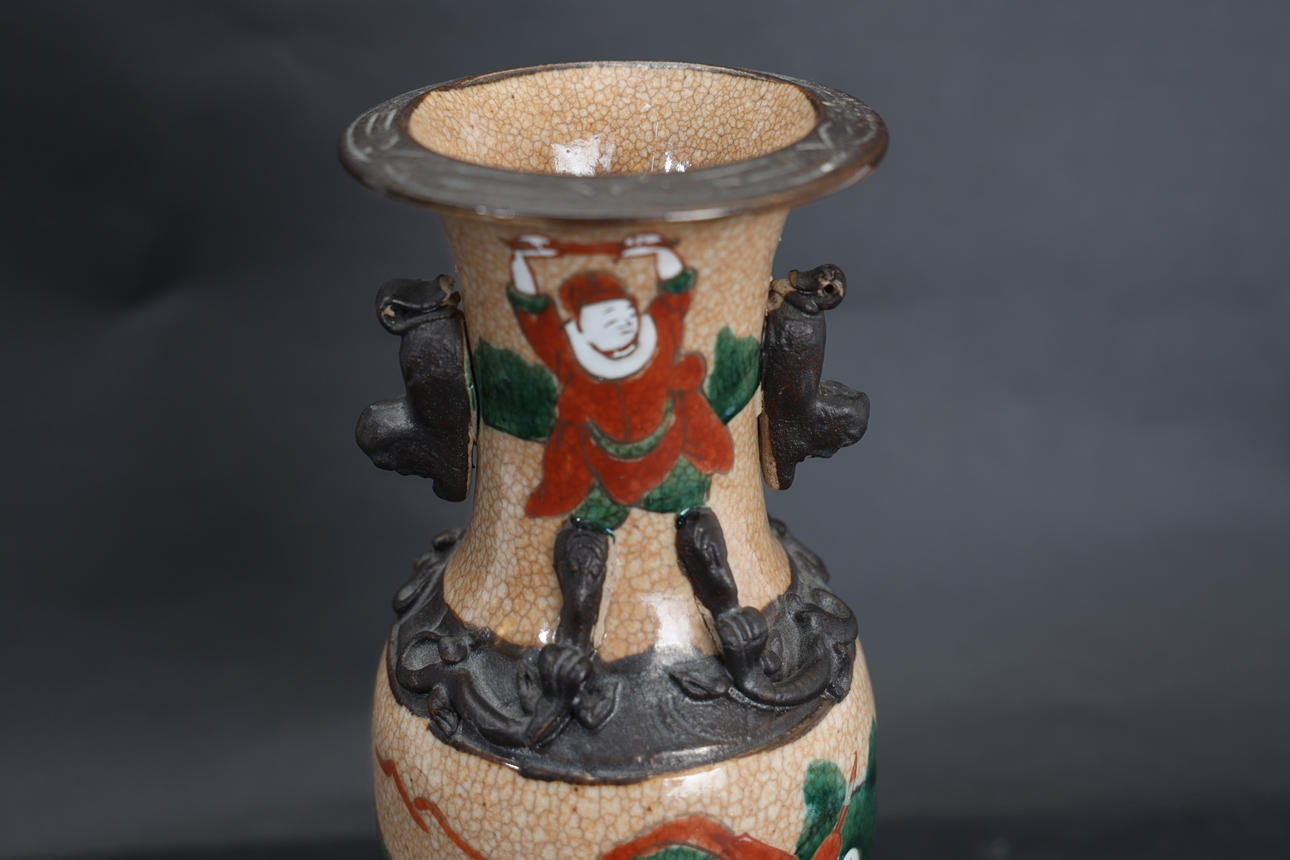 With relief decor of lizards. Hand Painted Figure Scene. Double hankles. Signed. Height 29,5cm.