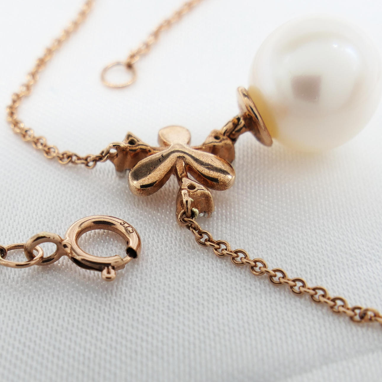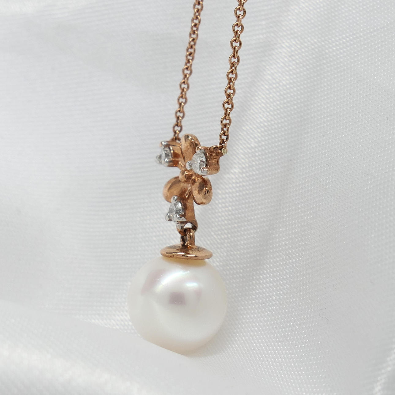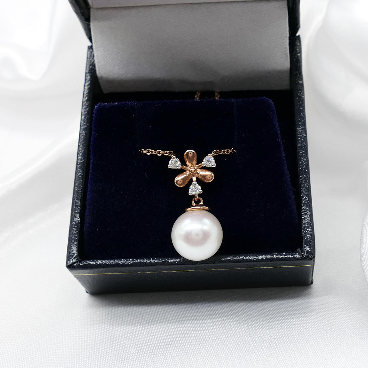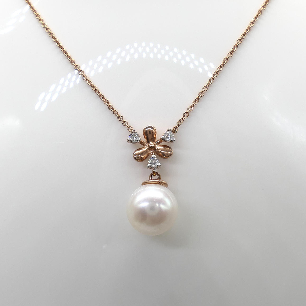 A snowflake-style necklace featuring a pearl and diamond integral pendant and chain, with and gift box