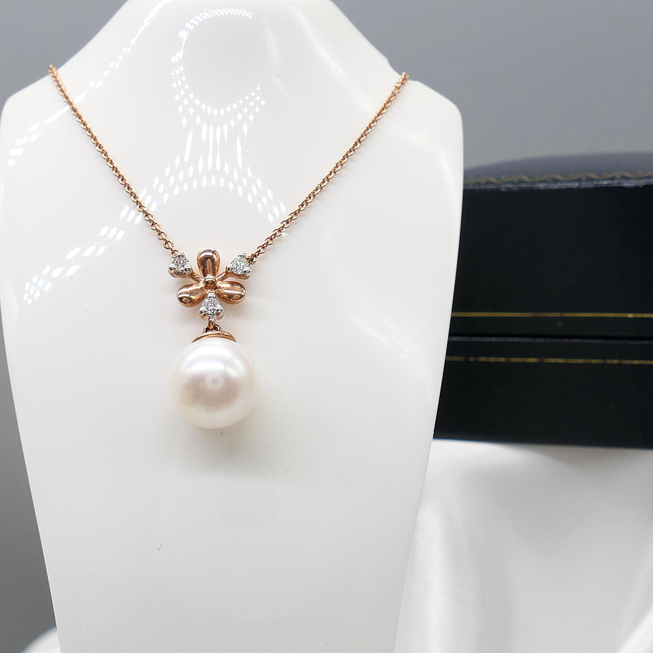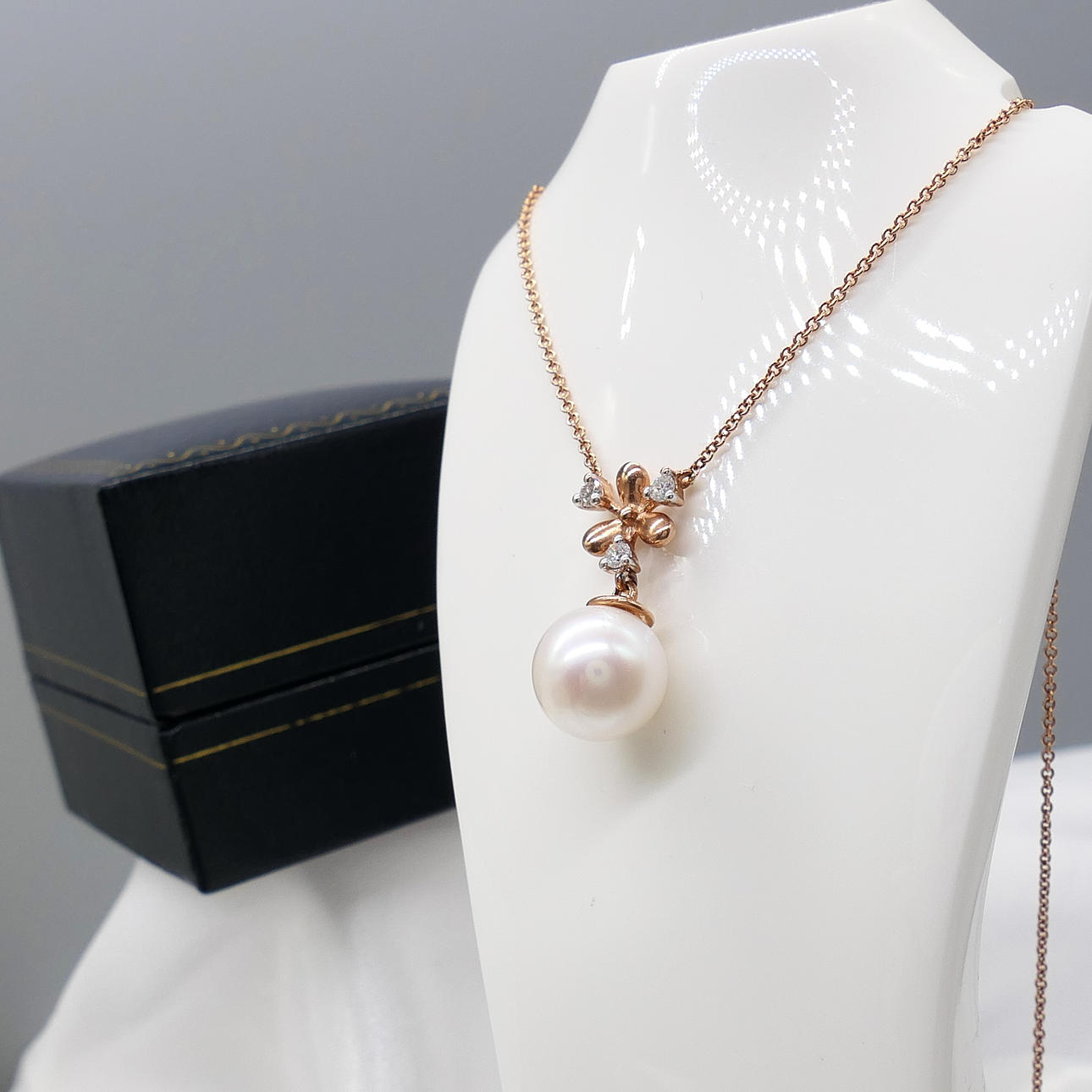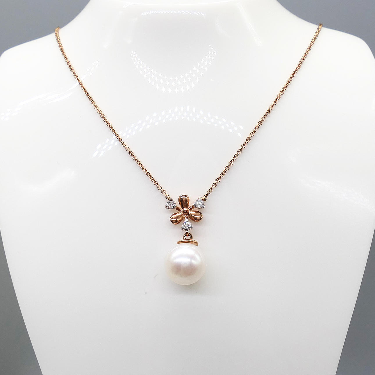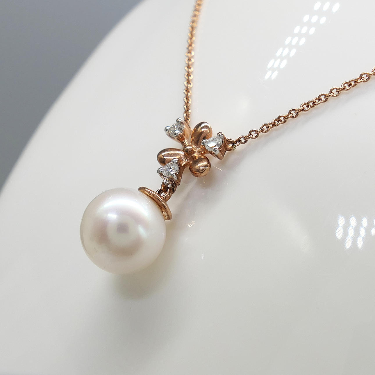 A snowflake-style necklace featuring a pearl and diamond integral pendant and chain, with and gift box