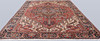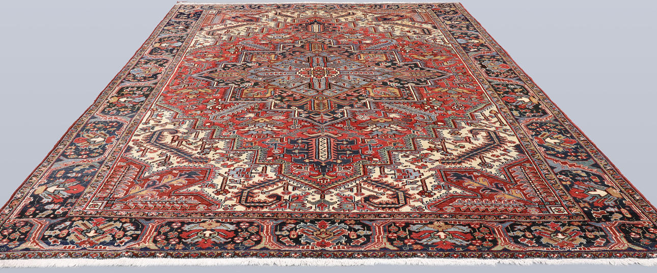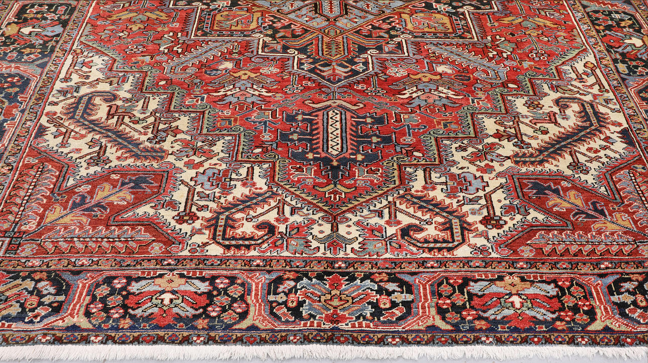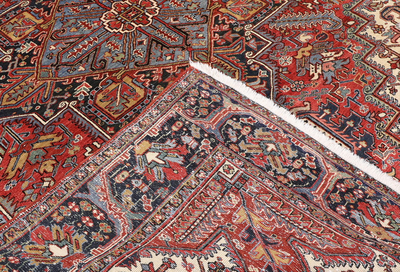 Semiantique Heriz with a red base color and a center field with a geometric medallion in blue, beige and dark tones. The decor consists of stylized flowers, palmettes and geometric shapes. The border has a dark bottom color and is decorated with geometric and stylized palmette tendrils. The forelock is made of wool and the warp is of cotton.