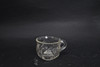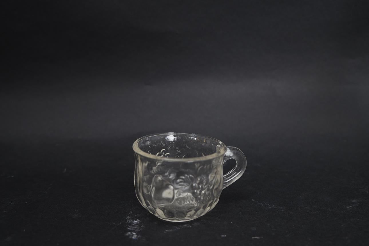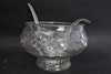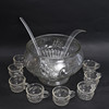 Glass, with relief decor. 8pcs mugs, bowl and 2pcs ladles in plastic. Bowl diameter 25cm.