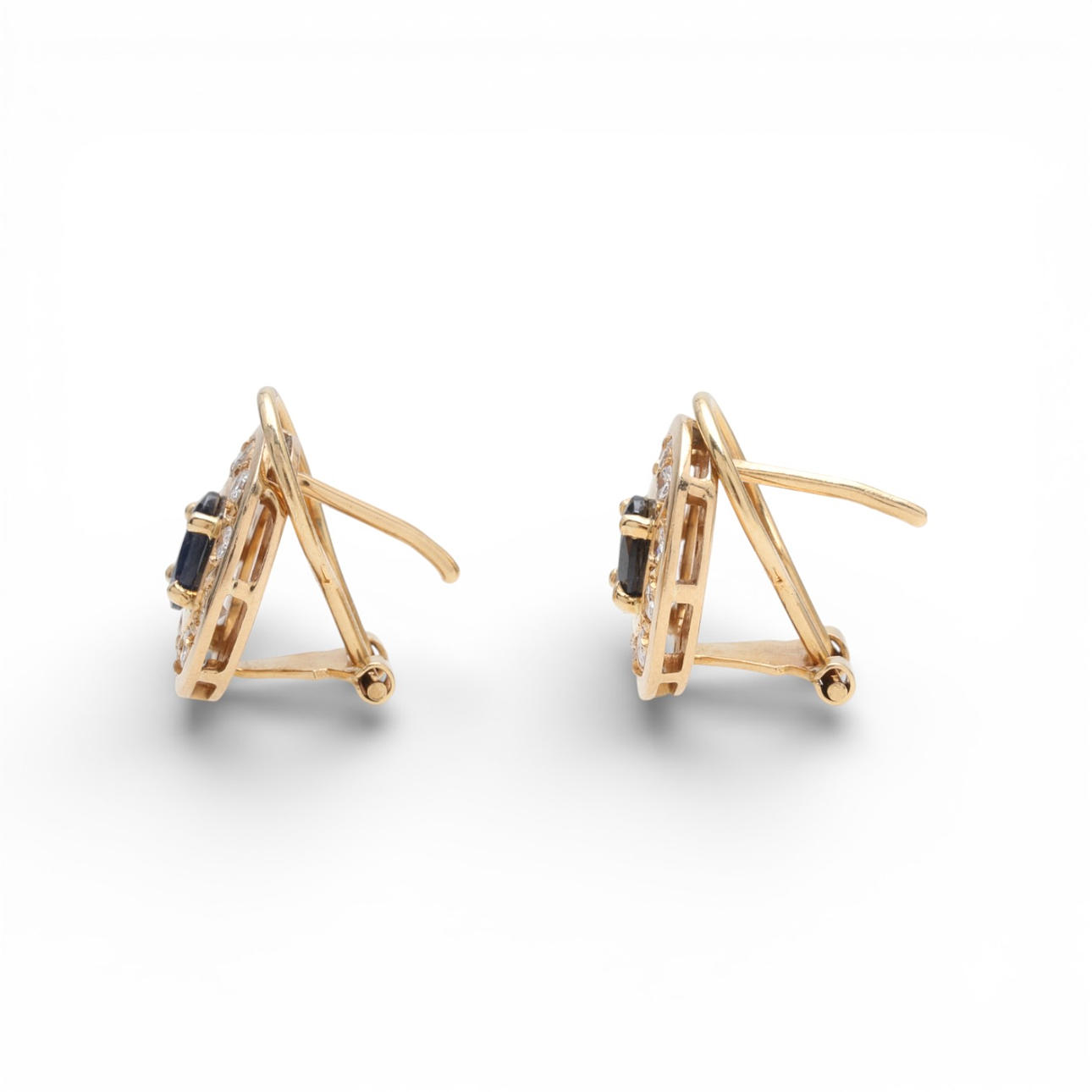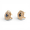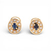 18K gold, oval cut sapphires, approx. 0.81 cts., and 16/16 cut diamonds, approx. 0.60 cts. 1.4 x 1.2 cm. 5.6 gr.