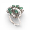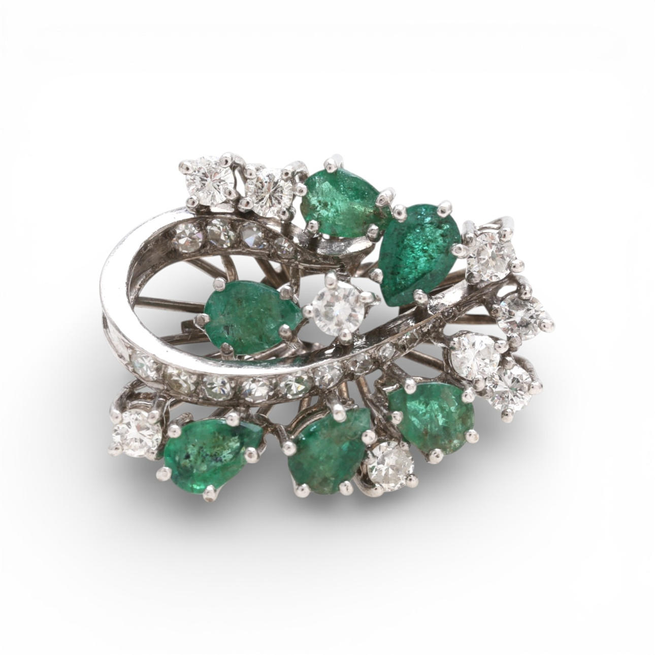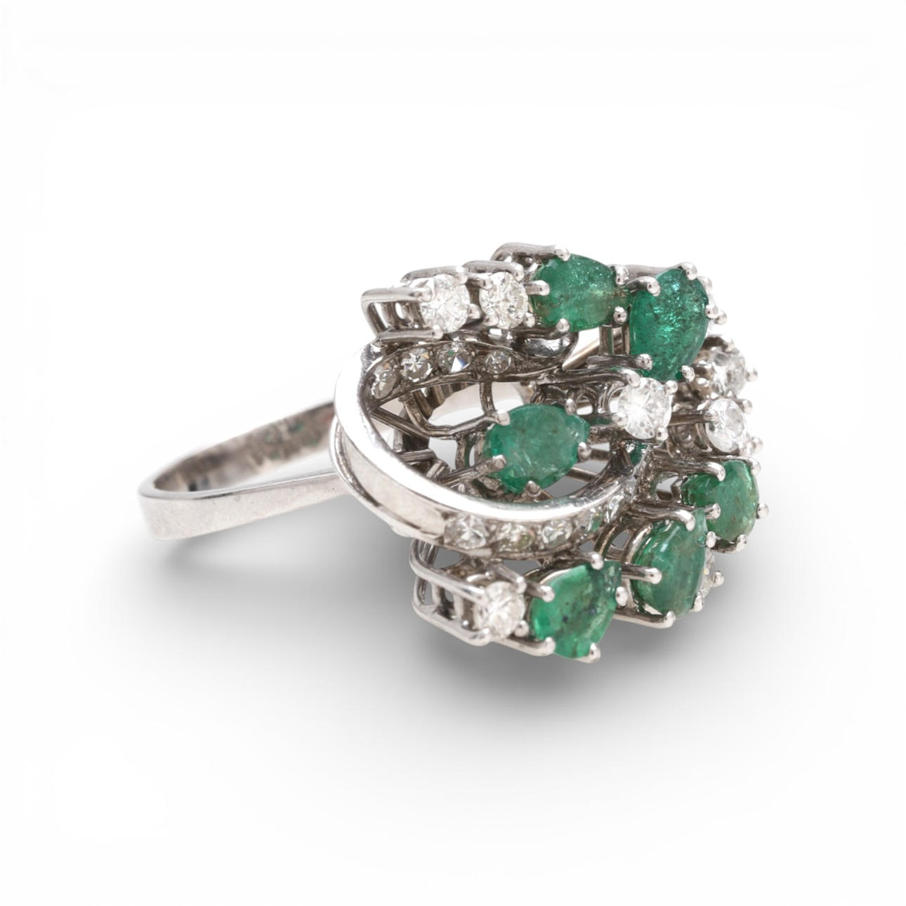 18K white gold, brilliant and 8/8 cut diamonds, approx. 0.70 cts., and pear cut emeralds, approx. 1.98 cts. Size 22/62. 9 gr.