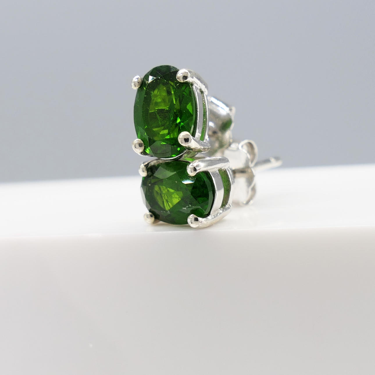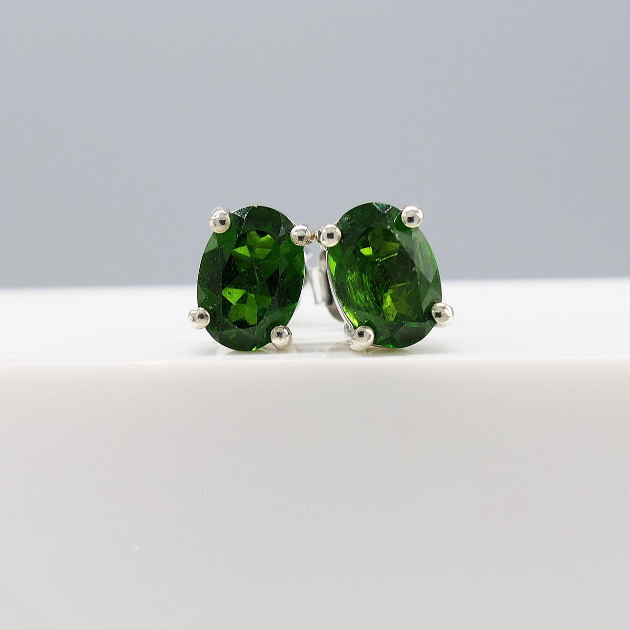 Gemstones: natural chrome diopside; 2 x oval-cut; 7 x 5mm each; 1.00ct total approx; deep green colour