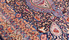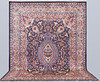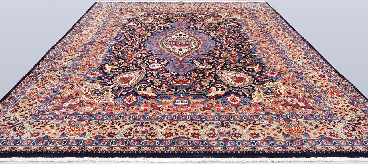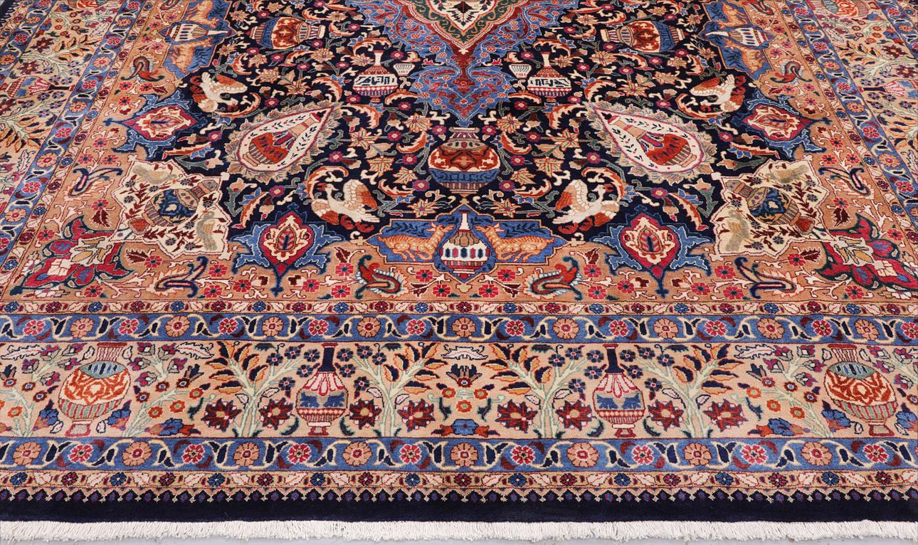 Cashmere with a dark blue bottom color and a central medallion field designed like an urn. The center field is decorated with figural and floral ornamentation consisting of urns, birds, palmettes, arabesques and stylized flowers in blue, beige, red and pink. The border has a light base color and is decorated with recurring urn motifs and plant decor, finished with a dark outer border. The forelock is made of wool and the warp is of cotton.