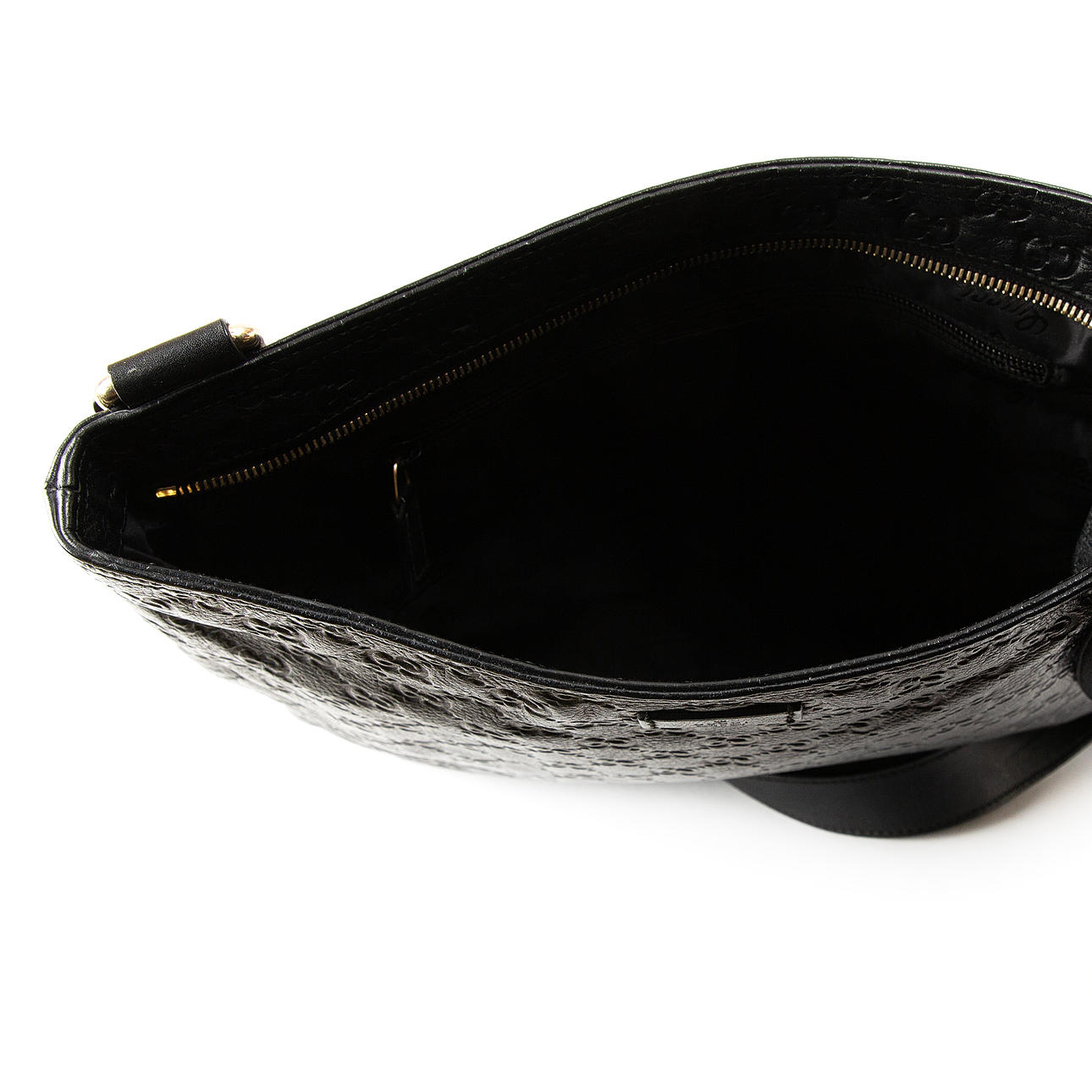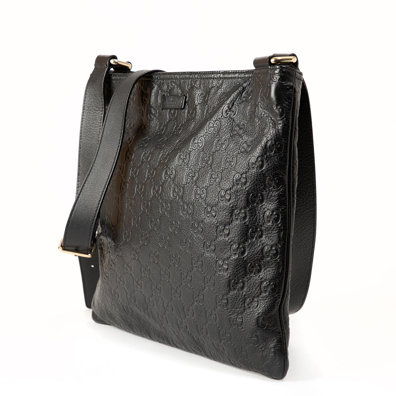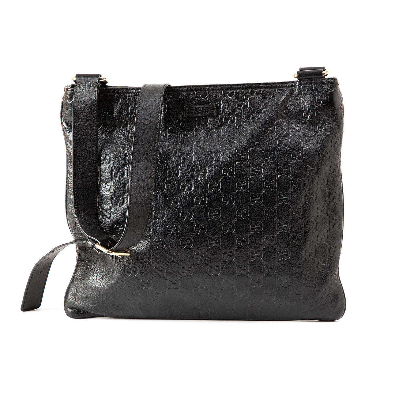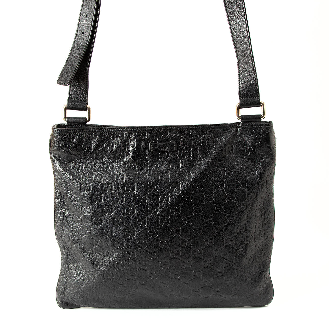 With embossed monogram pattern. Adjustable shoulder strap. Inside upholstered with Gucci branded nylon fabric. Closes with zipper. Made in Italy.