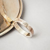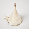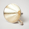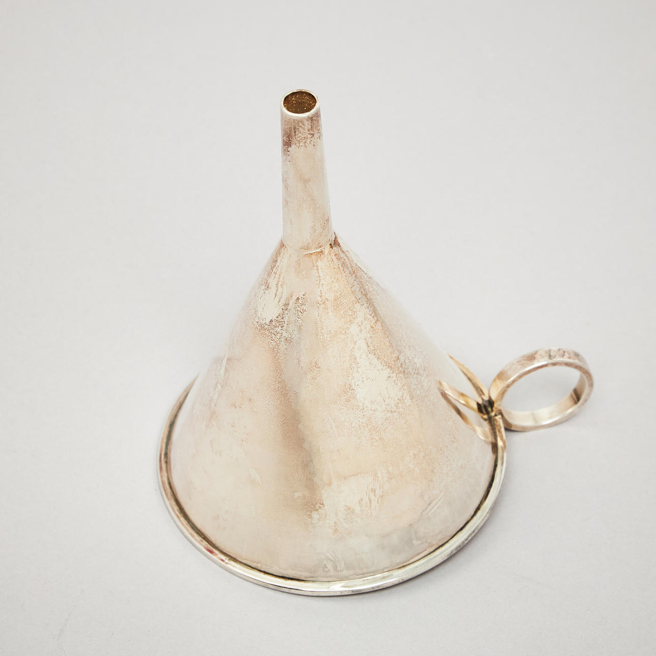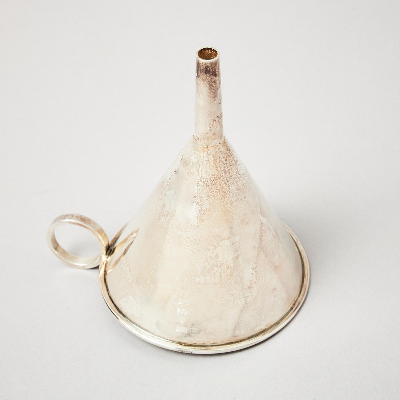Smooth, with slightly beaten decor, ring-shaped grip. Height 13 cm, weight 130 grams.