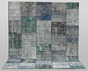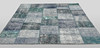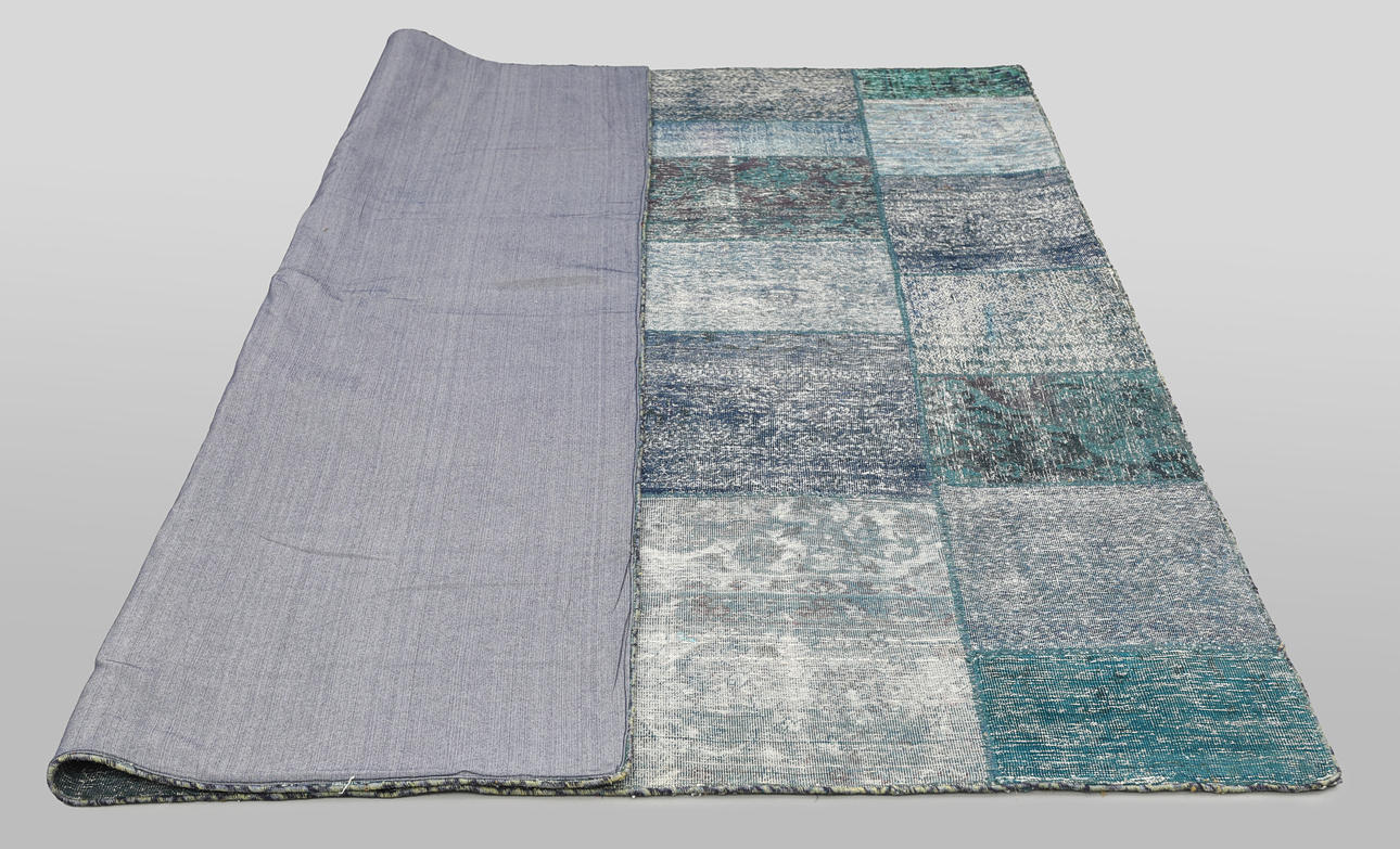 Vintage patchwork carpet composed of jointed older carpet fragments in different shades of blue with varying texture.