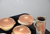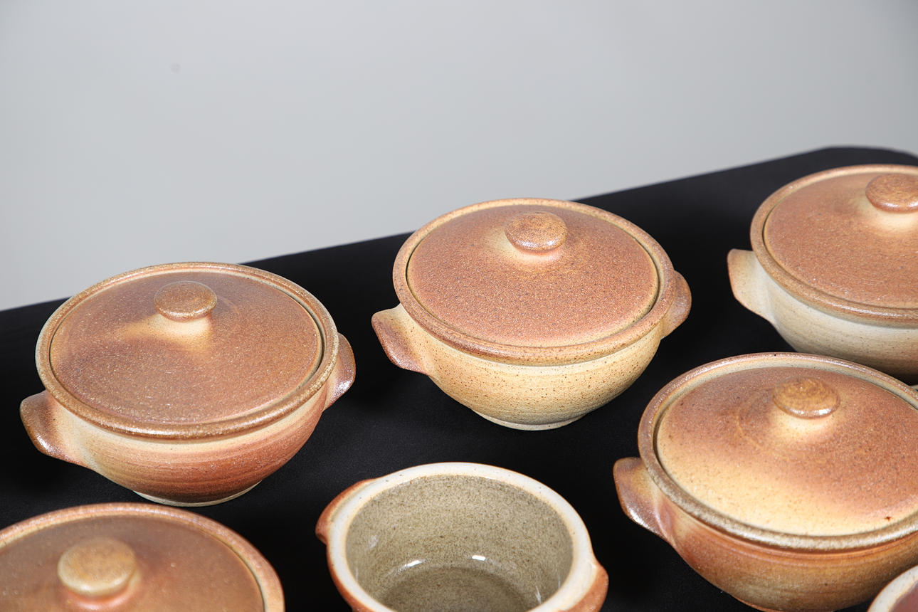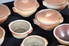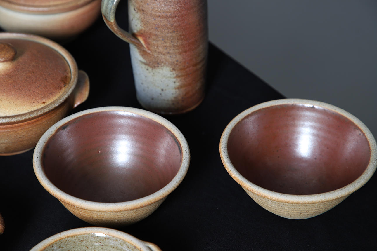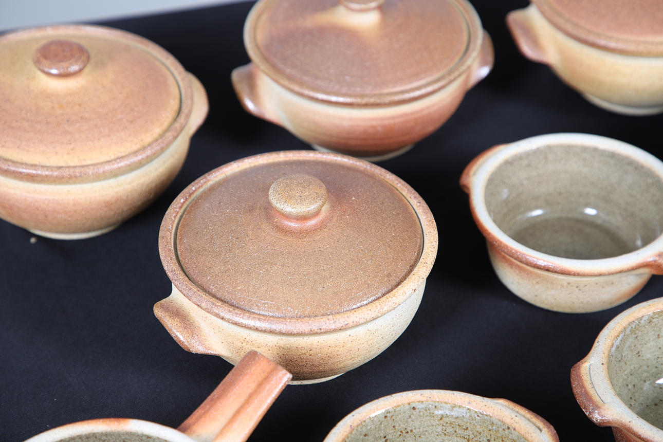 Including a set of six lidded pottery bowls (approx 17cms across), two cereal bowls with a glazed interior (14cms diameter), four small two handled bowls (13.5cms across), jug (17.5cms high) etc.