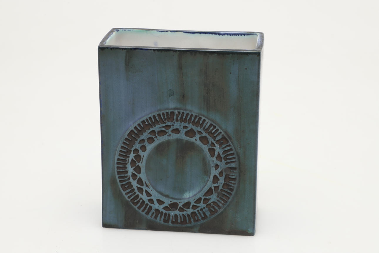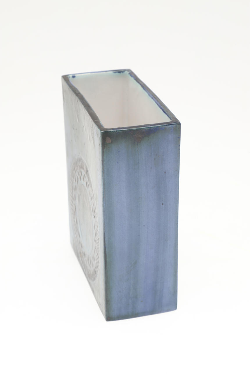 The flat sided vase with a smooth glaze and stylised design to each side. With painted marks, 'Troika, Cornwall, England', potters mark for Anne Lewis. 12cms high, 9.5cms across.