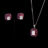 A 925 silver moonstone and ruby set pendant and chain together with a matching pair of silver earrings, pendant length 3.5cm, chain length approx. 70cm.