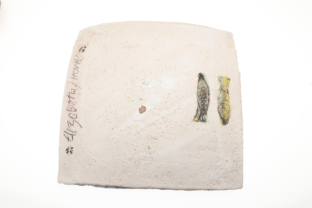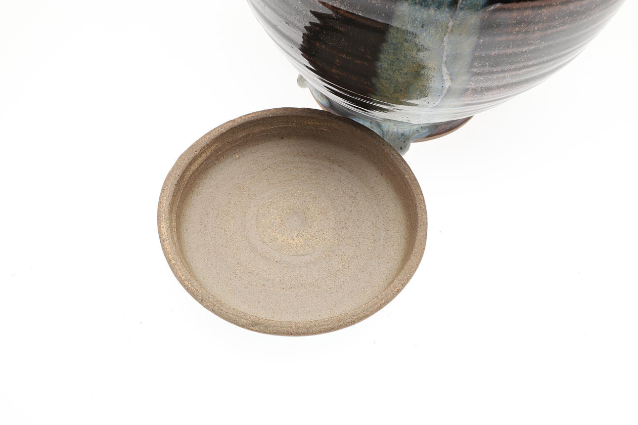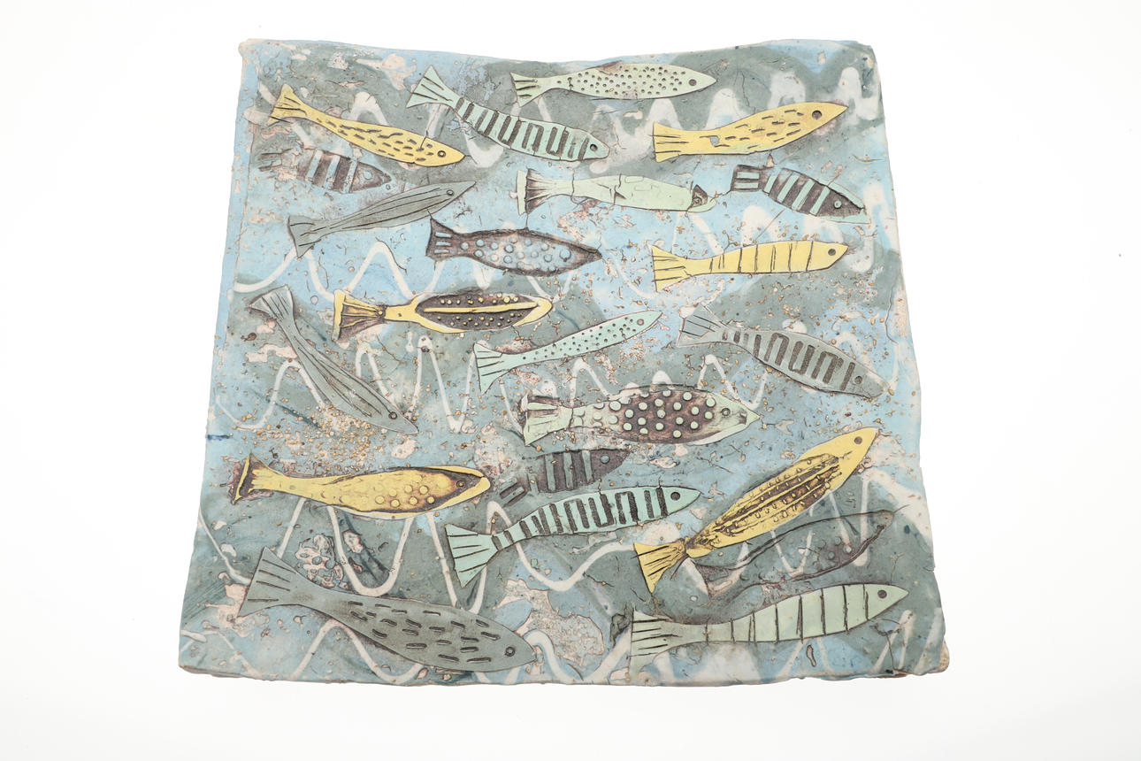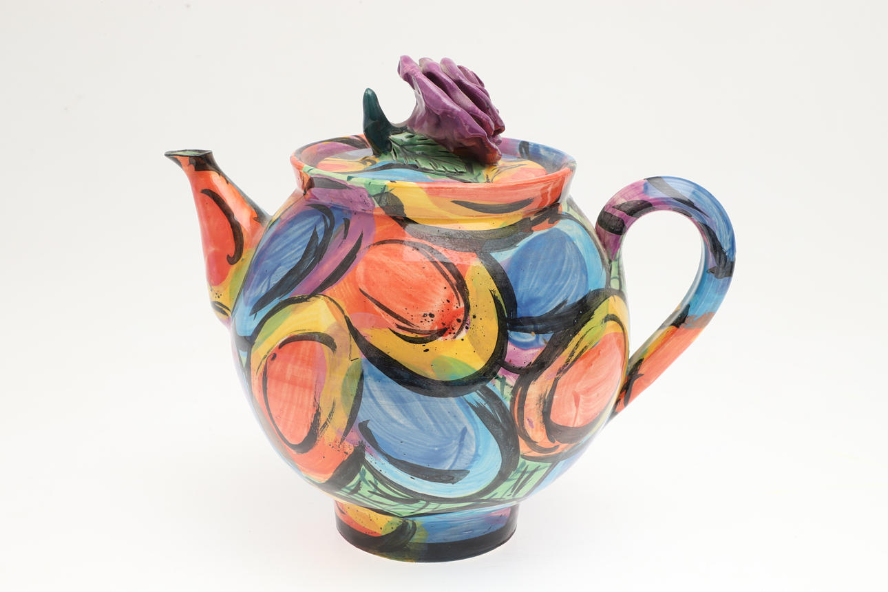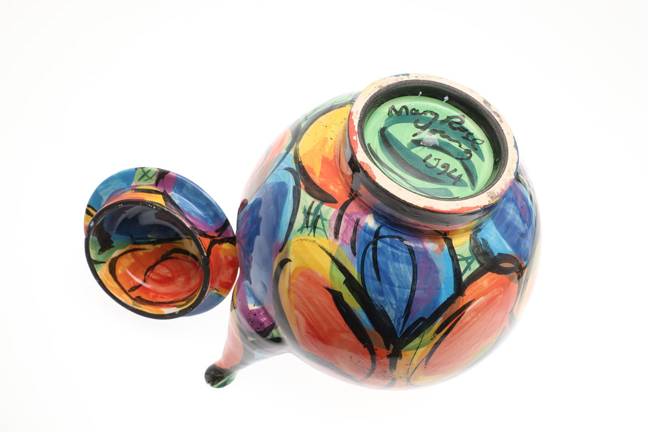 Including a pottery fish decorated dish by Elizabeth T Howe (21cms square), a brightly painted teapot by Mary Rose Young (20.5cms high), a stoneware vase with textured surface (signed, 15cms high), a lidded stoneware jar (23.5cms high, signature to the base), and a small pottery yunomi (9cms high, monogram mark). (5).
