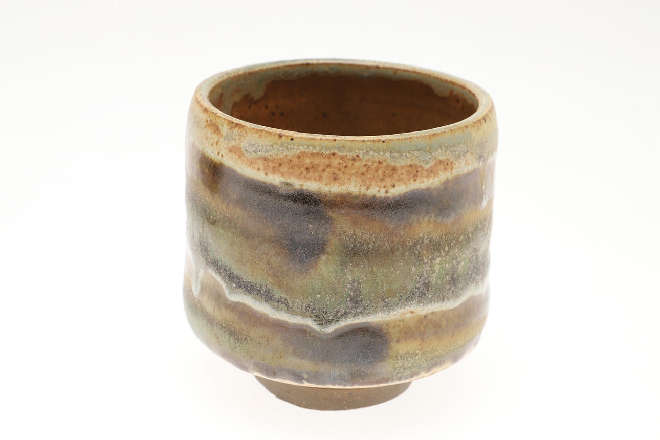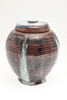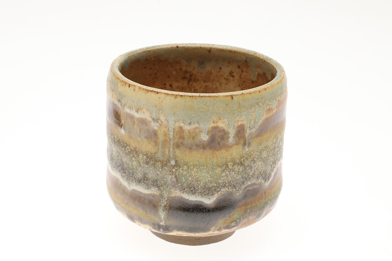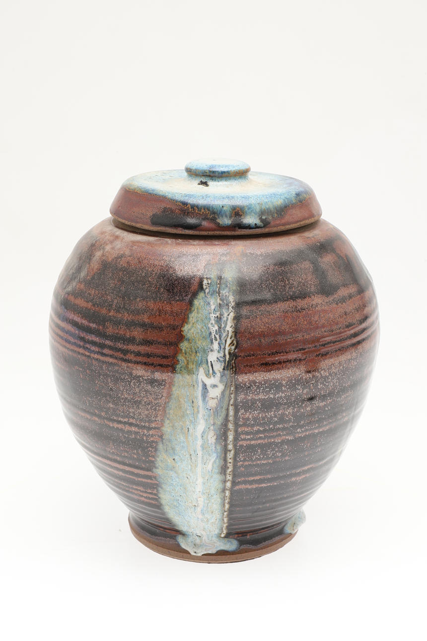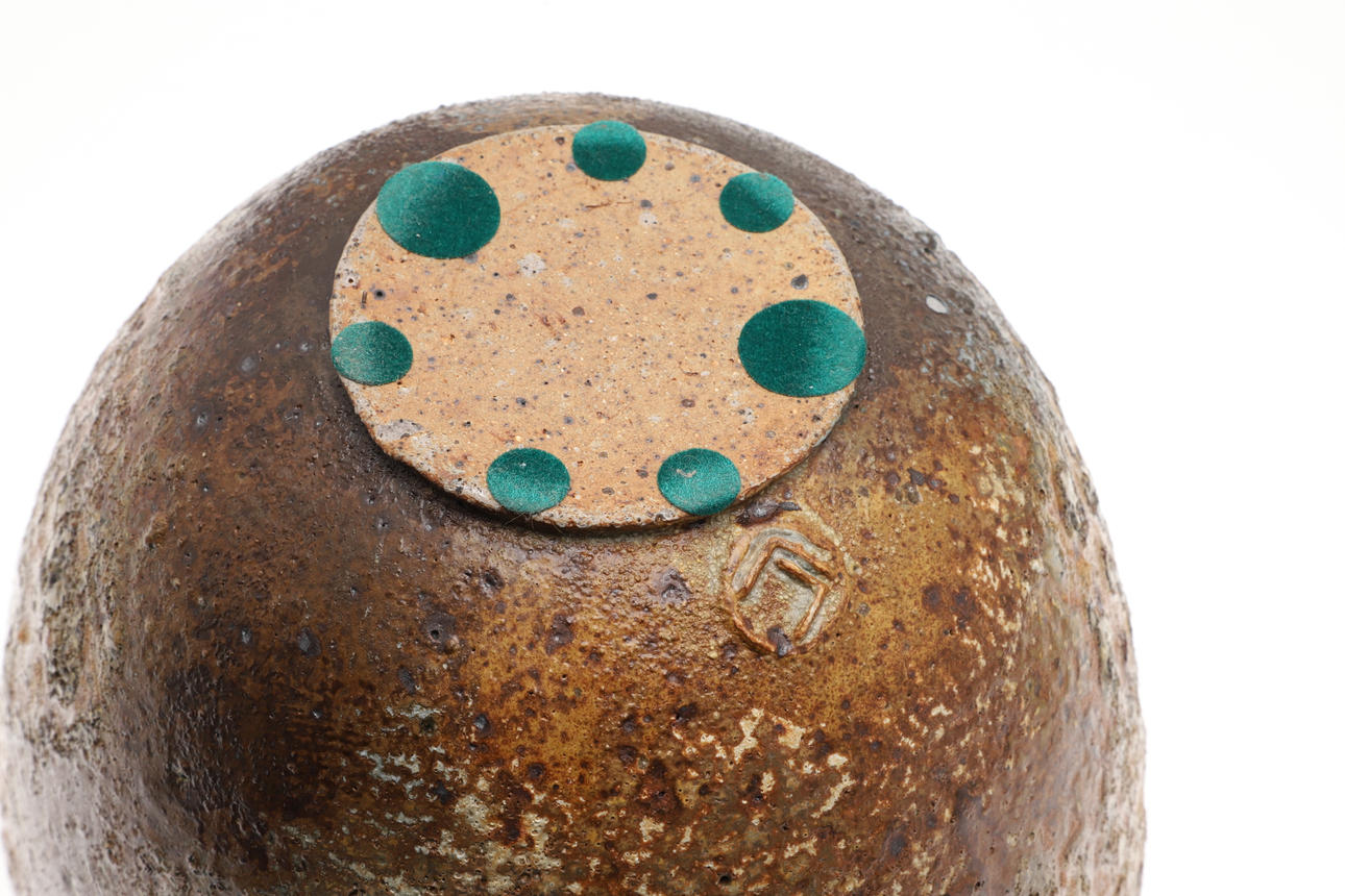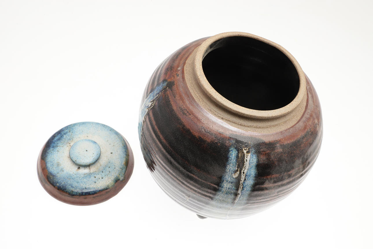 Including a pottery fish decorated dish by Elizabeth T Howe (21cms square), a brightly painted teapot by Mary Rose Young (20.5cms high), a stoneware vase with textured surface (signed, 15cms high), a lidded stoneware jar (23.5cms high, signature to the base), and a small pottery yunomi (9cms high, monogram mark). (5).