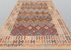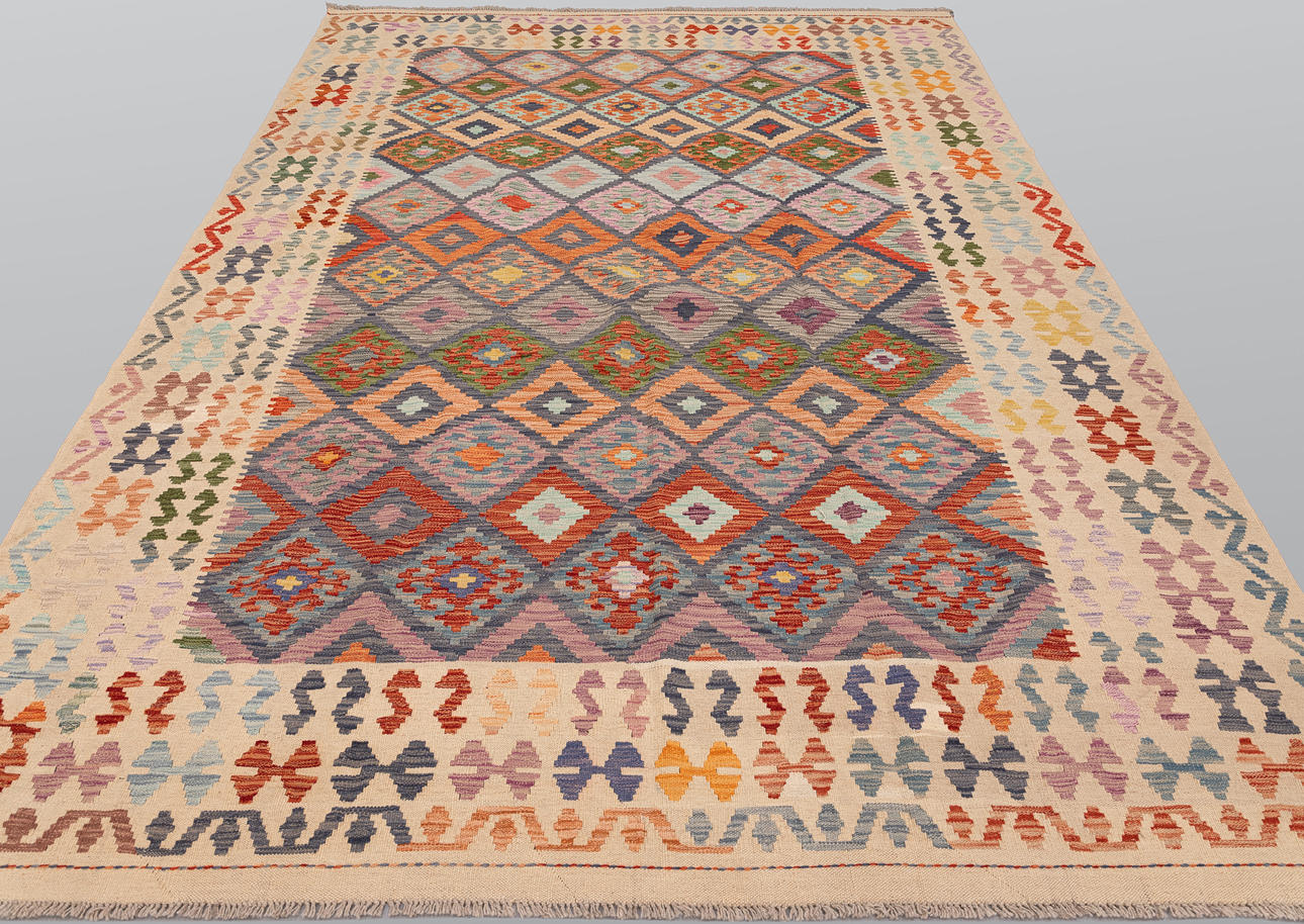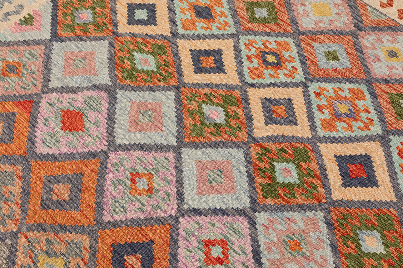 Hand-woven Kelim in classic design with geometric pattern in polychrome color scale.