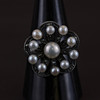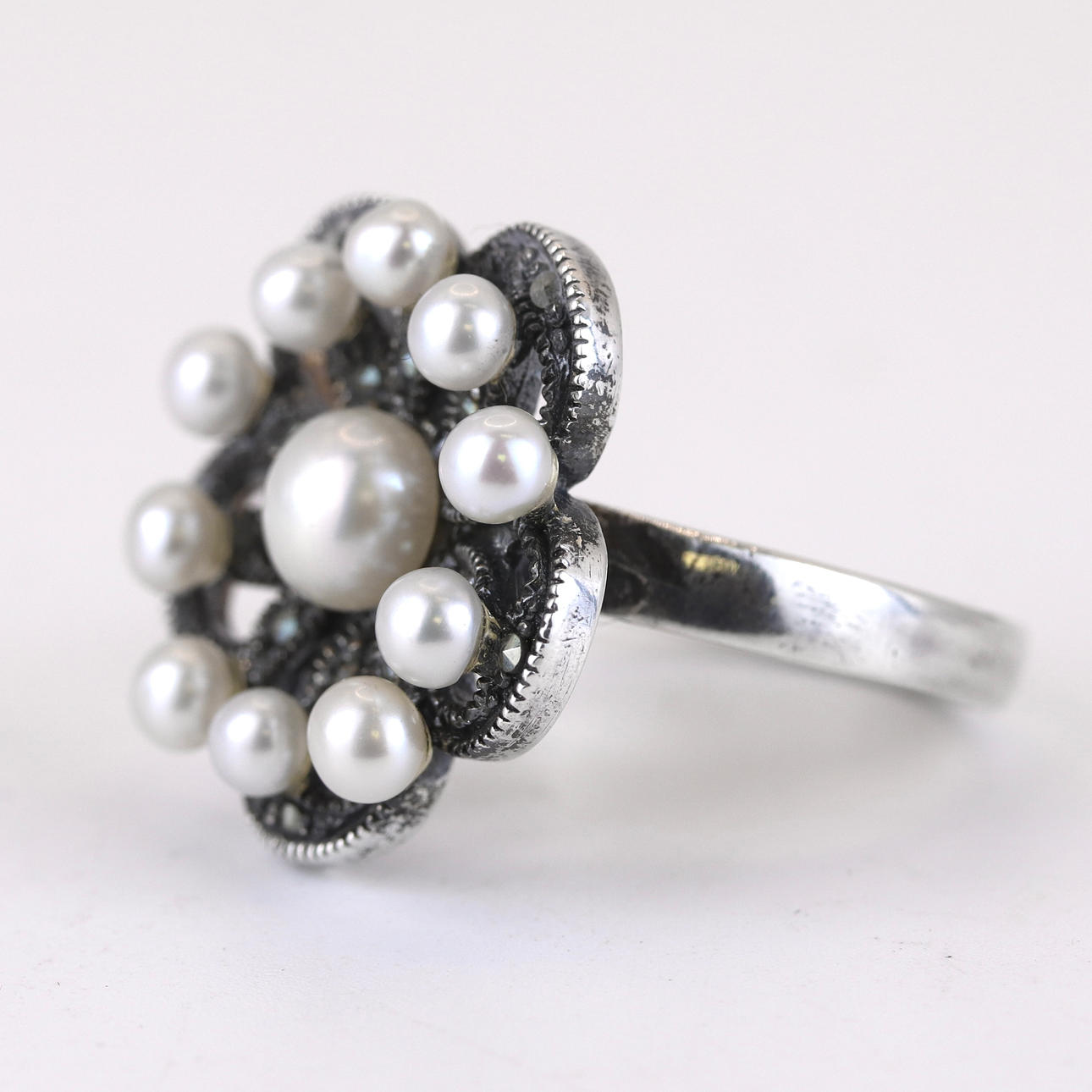 SILVER PEARL AND MARCASITE FLOWER RING.