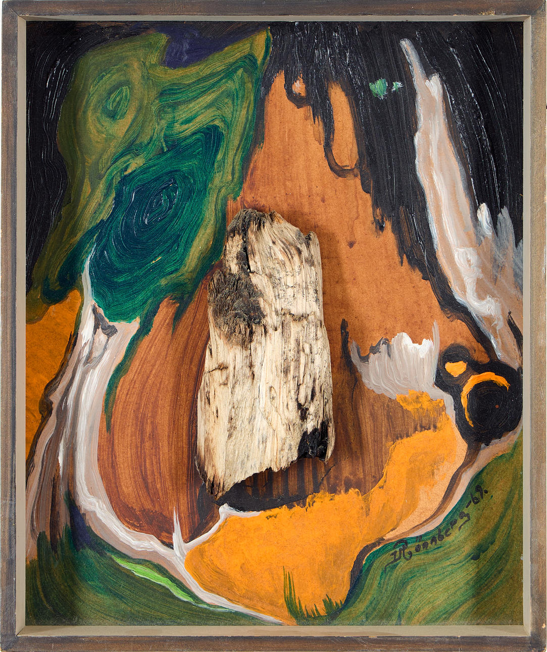 Oil on panel with piece of wood. Signed and dated I Rönnberg -69. 32 x 26.5 cm.