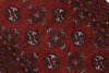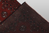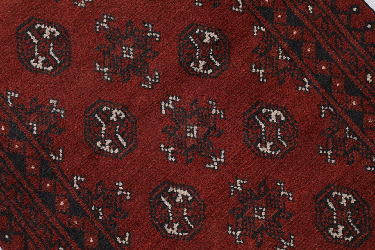 Afghan gallery model with a dark red bottom color and a center field covered in repeating lake motifs in darker shades with bright details. The border consists of repeating geometric patterns in similar colors. The bangs are made of wool and the warp is made of cotton.