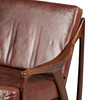 The teak framed armchair with faux leather cushions, 77cm height, 78cm width, 82cm depth.