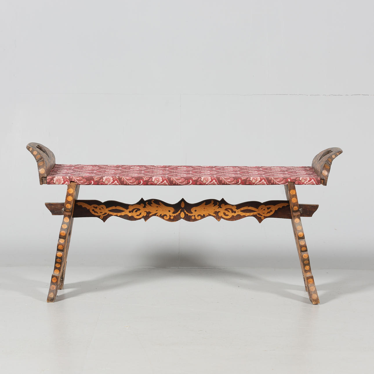 A 20th century intarsia bench.