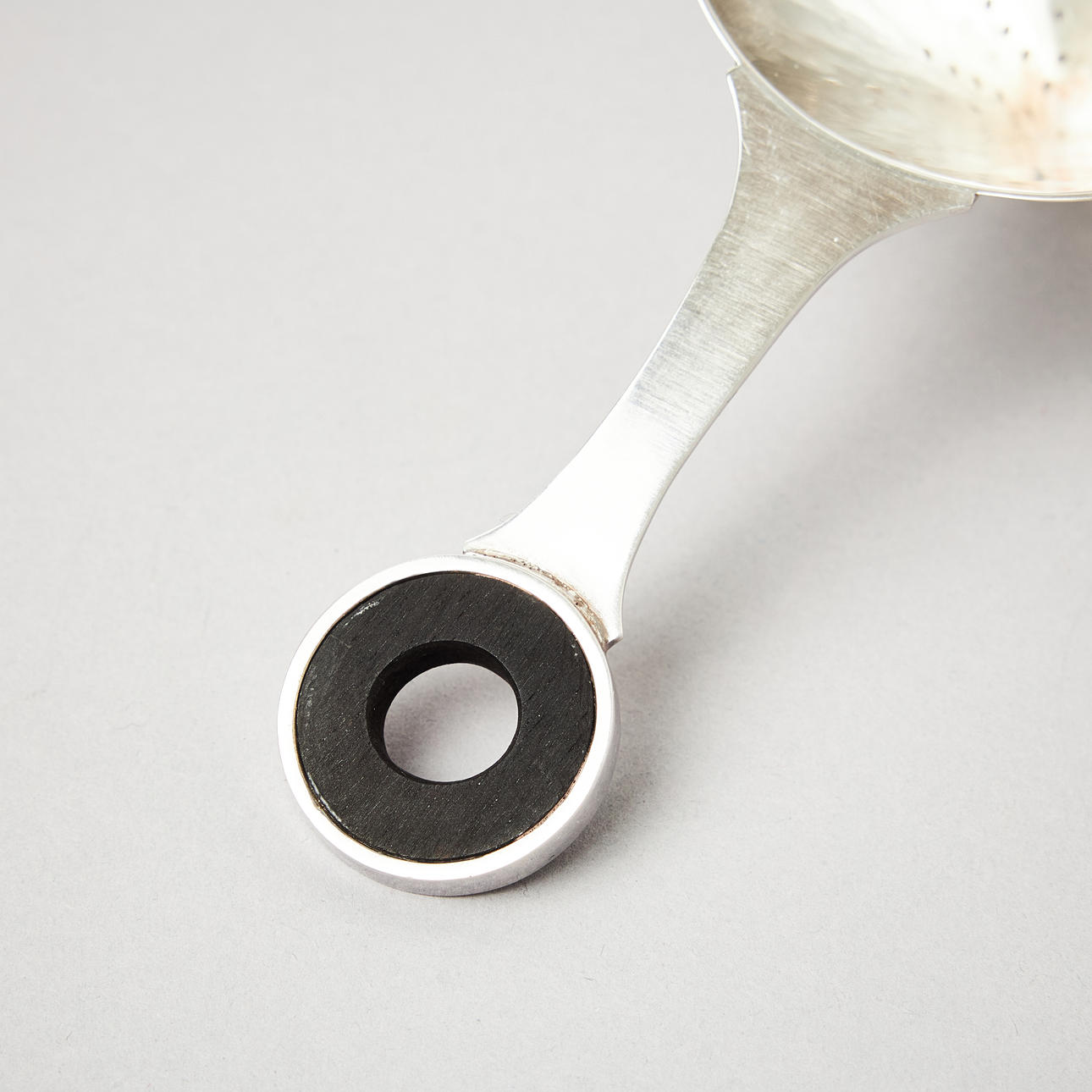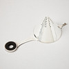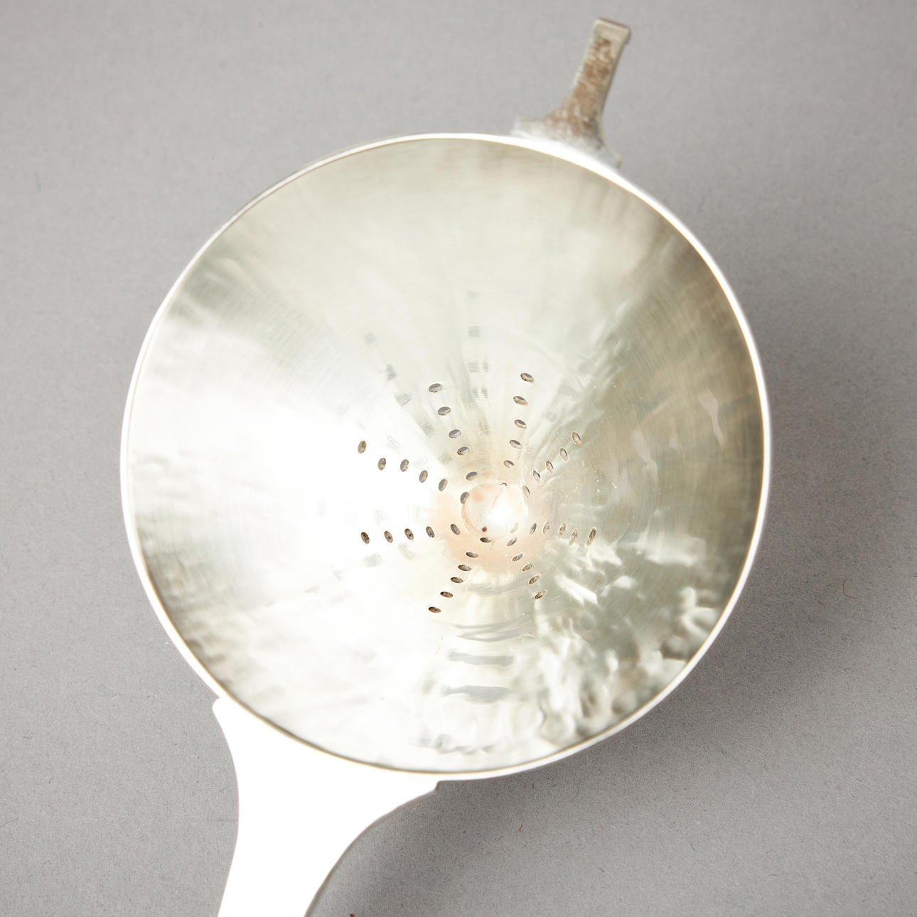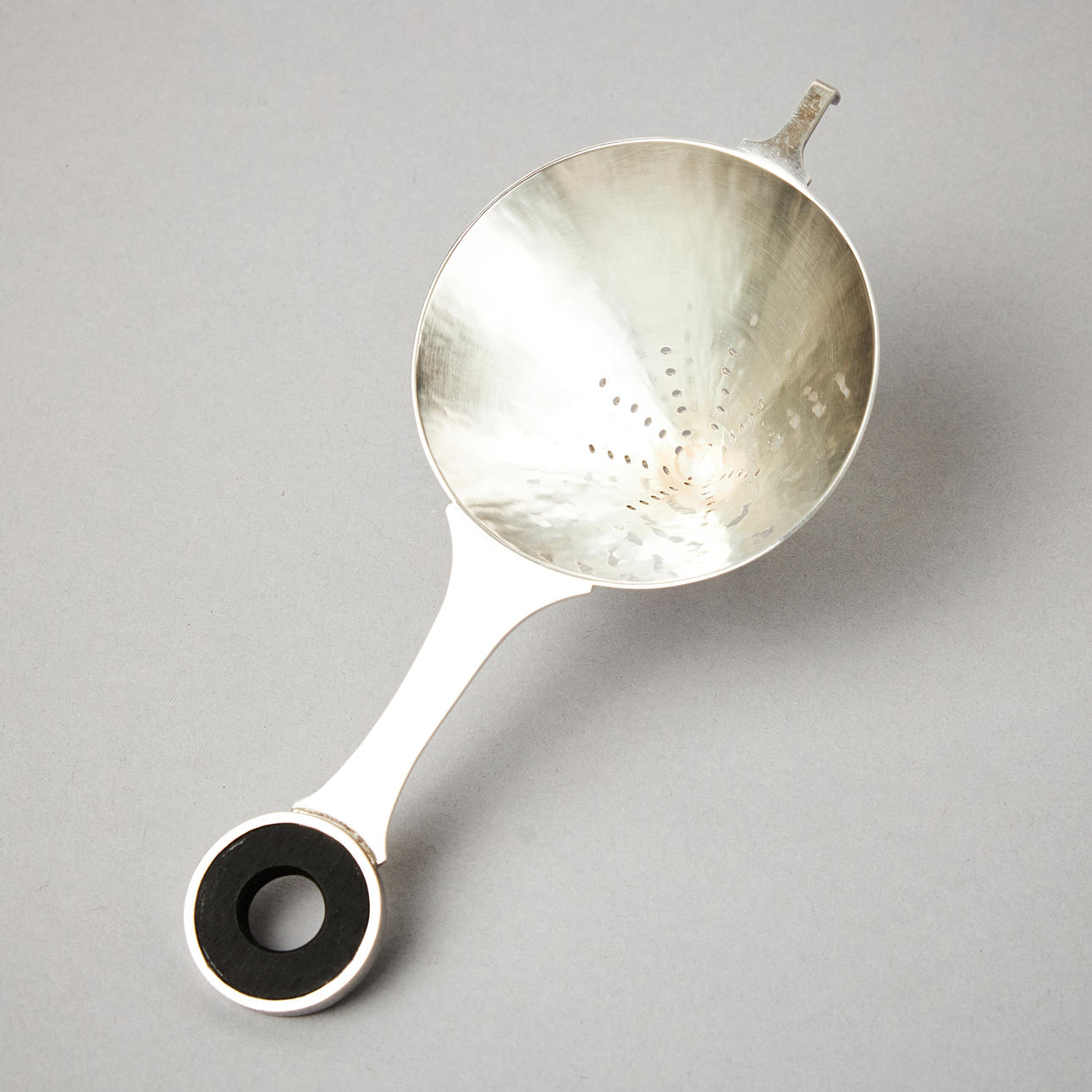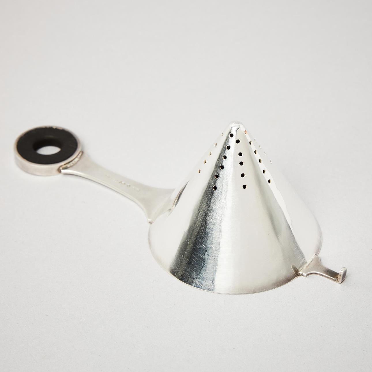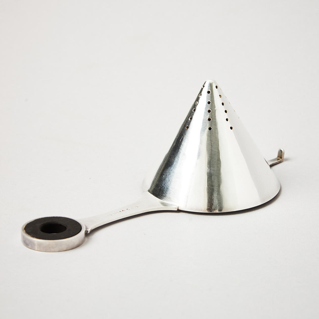 Plain, tapering strainer with a circular wooden handle and a drip cup with lightly hammered decoration. Length of strainer 15 cm, height of cup 6.3 cm, total weight 170 grams.